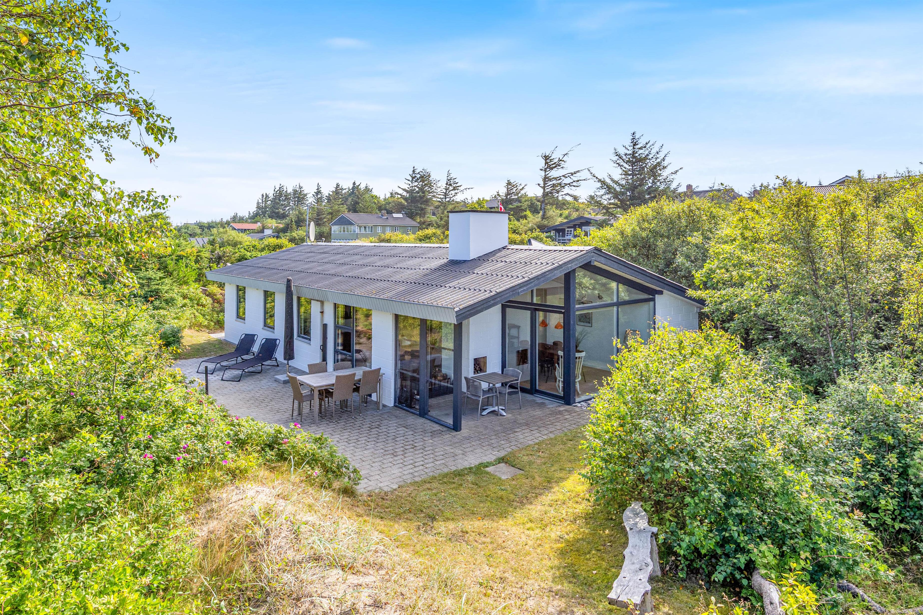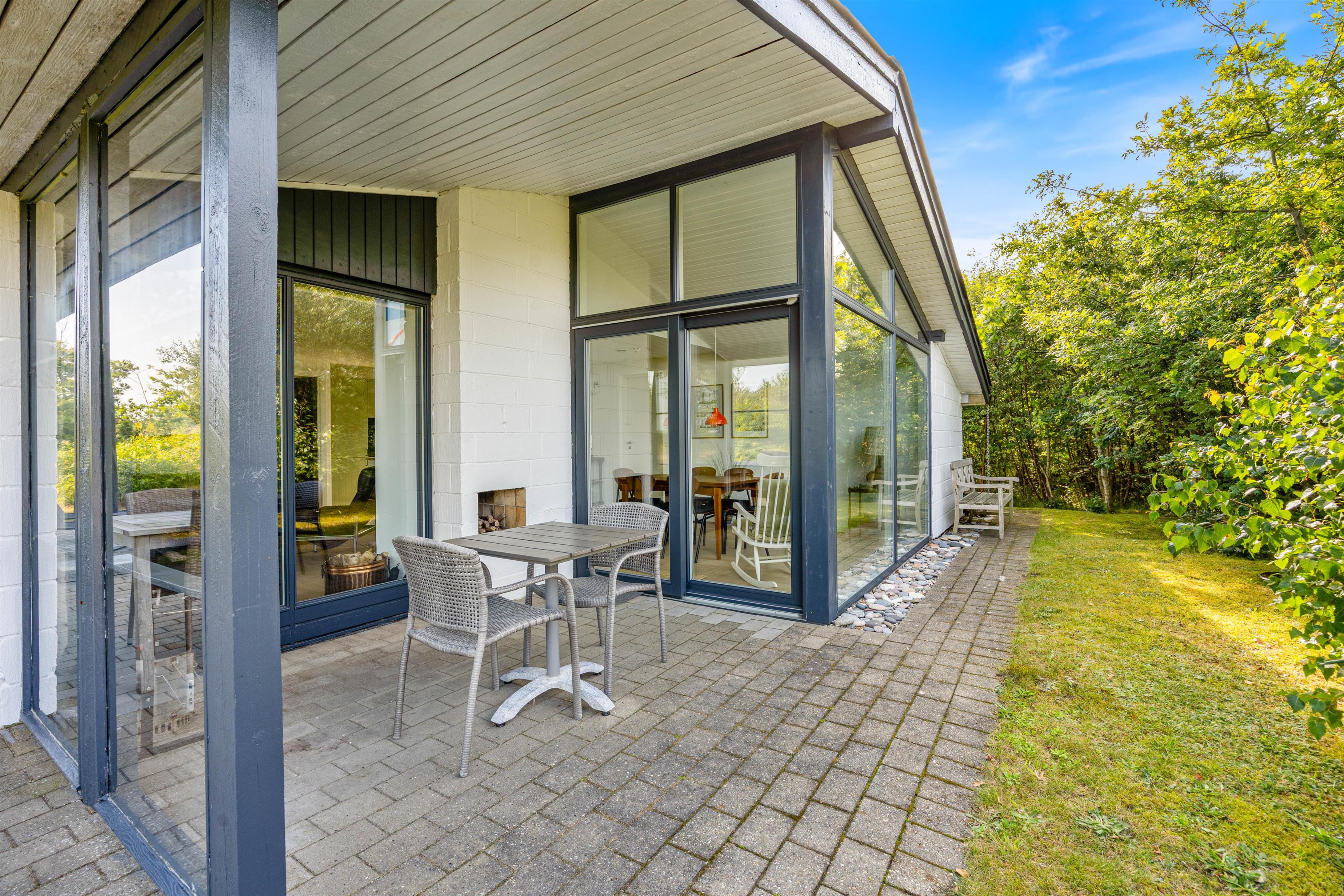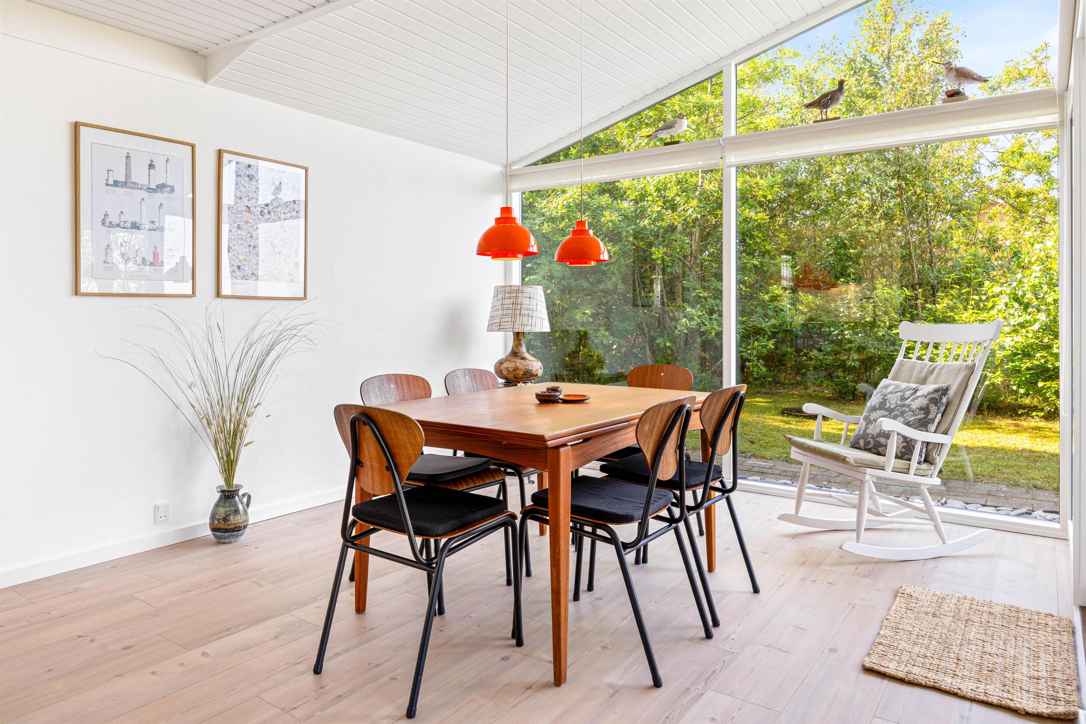 Indenfor mødes I af en varm og hjemlig stemning i det åbne opholdsrum, hvor køkken, spiseplads og stue flyder naturligt sammen. Midt i det hele står den hyggelige brændeovn, som spreder varme og hygge især på kølige aftener.