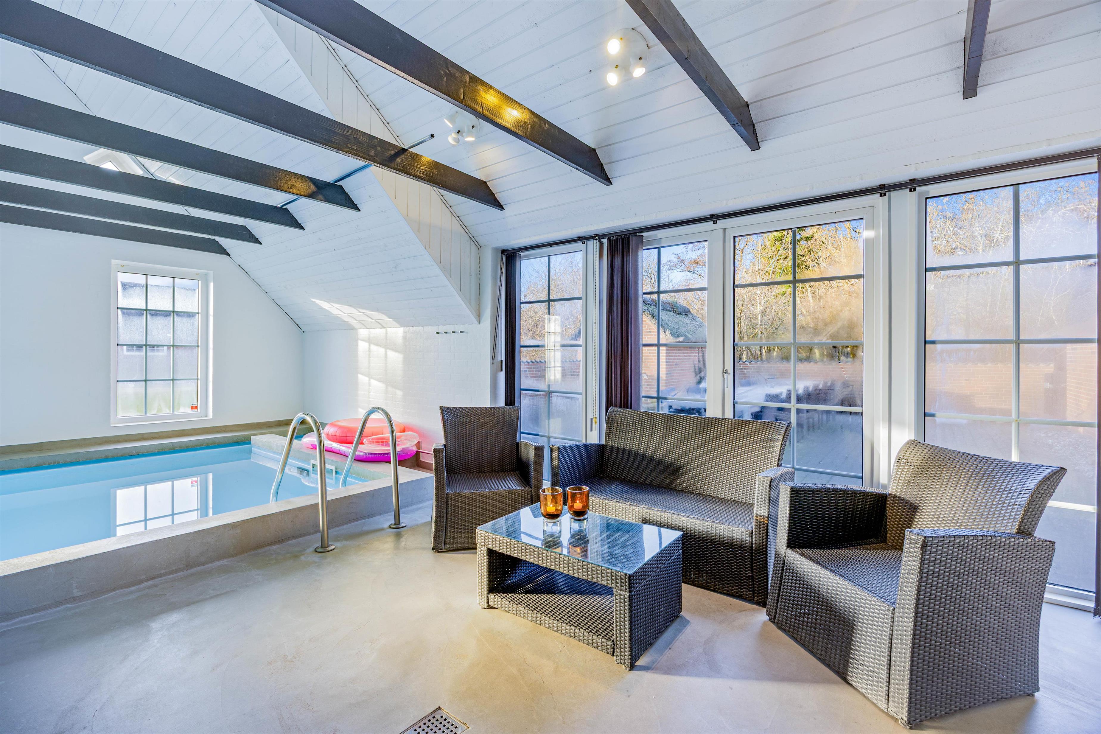 Poolområde med stor swimmingpool, spabad og sauna