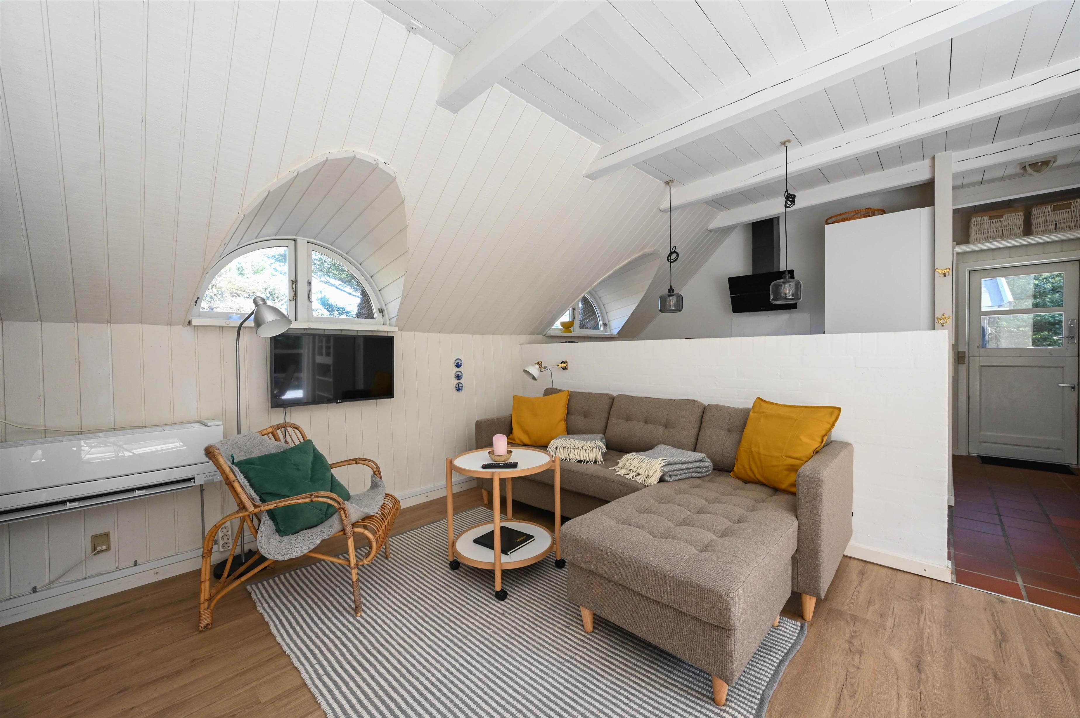 Her er der spiseplads, sofagruppe, brændeovn og varmepumpe, som tilsammen giver både varme og hygge – uanset årstid.