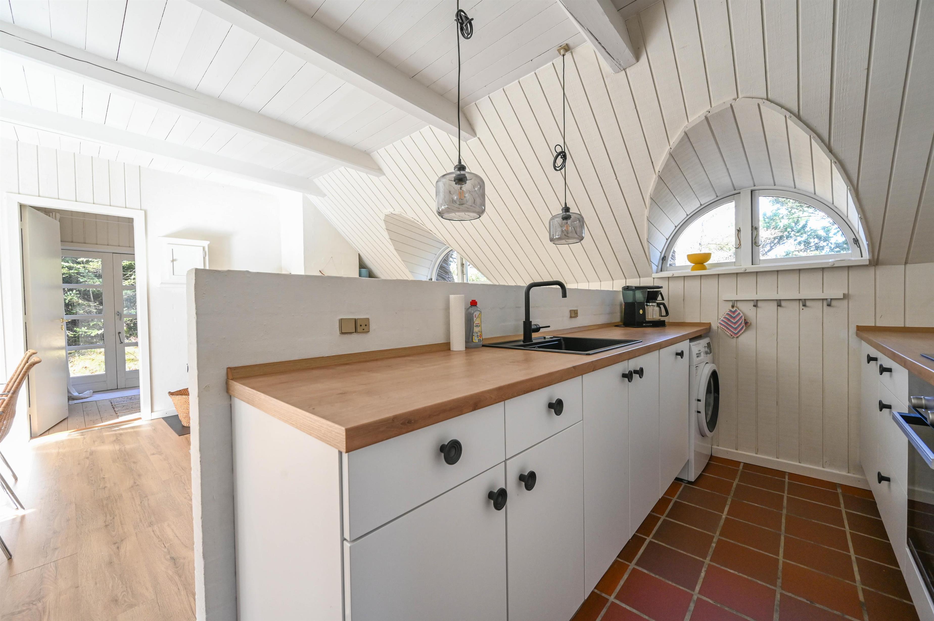 Det lyse køkken ligger i åben forbindelse med stuen, hvor store vinduer lukker naturen ind og skaber en behagelig stemning.