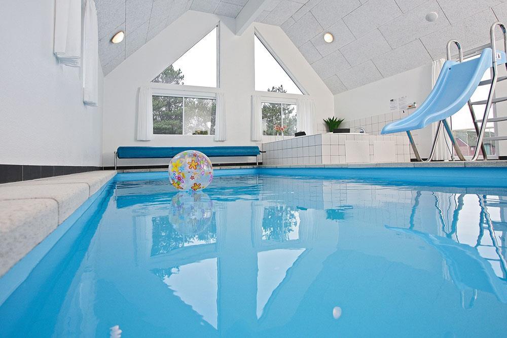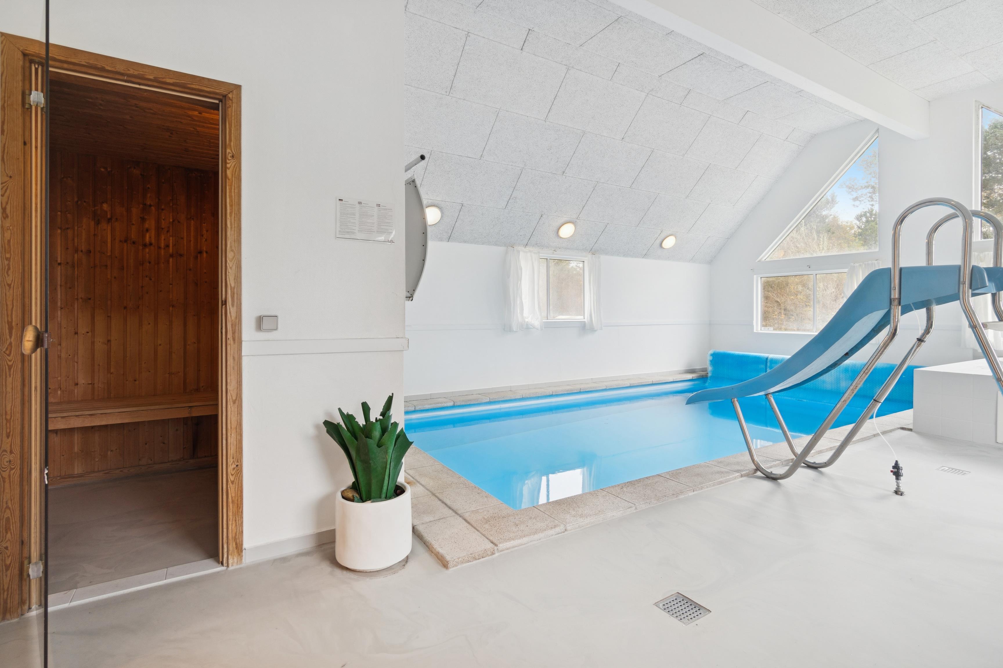 Den store poolafdeling er husets naturlige samlingspunkt og byder på en 20 m² swimmingpool med modstrømsanlæg, vandrutsjebane, spa til 4–6 personer og en afslappende sauna. Der er også et stort badeværelse tilknyttet poolområdet, så komforten er i top.