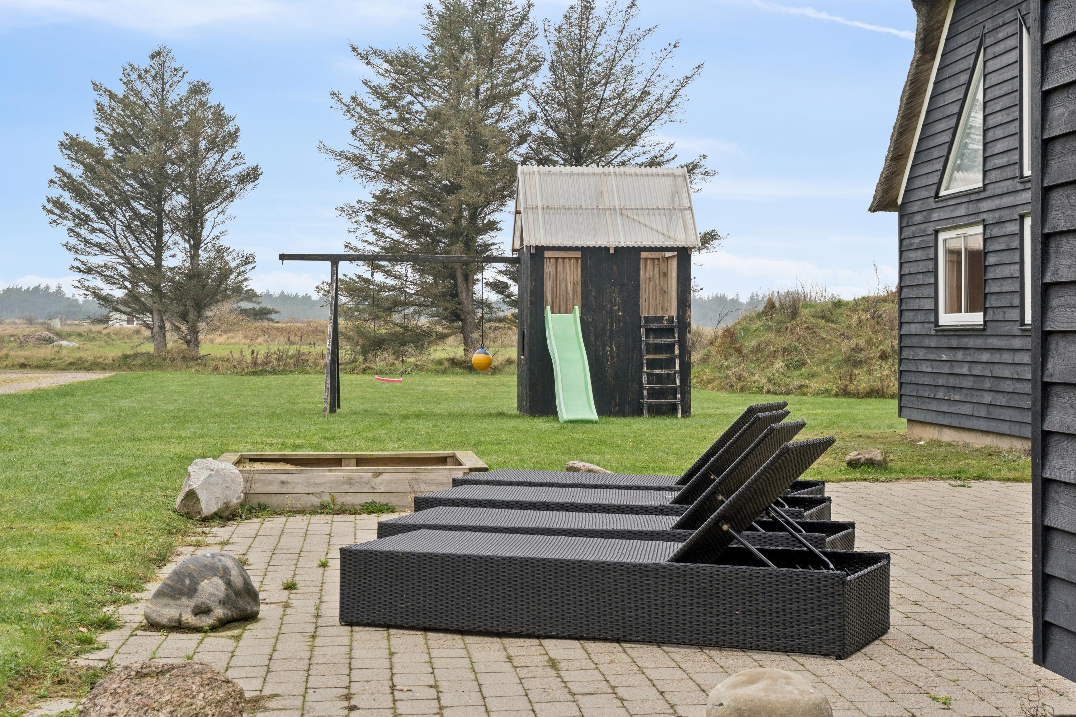 Udenfor kan du nyde solen og de friske vesterhavsvinde på de store terrasser, hvor der er grill og komfortable havemøbler, perfekt til hyggelige aftener under åben himmel.