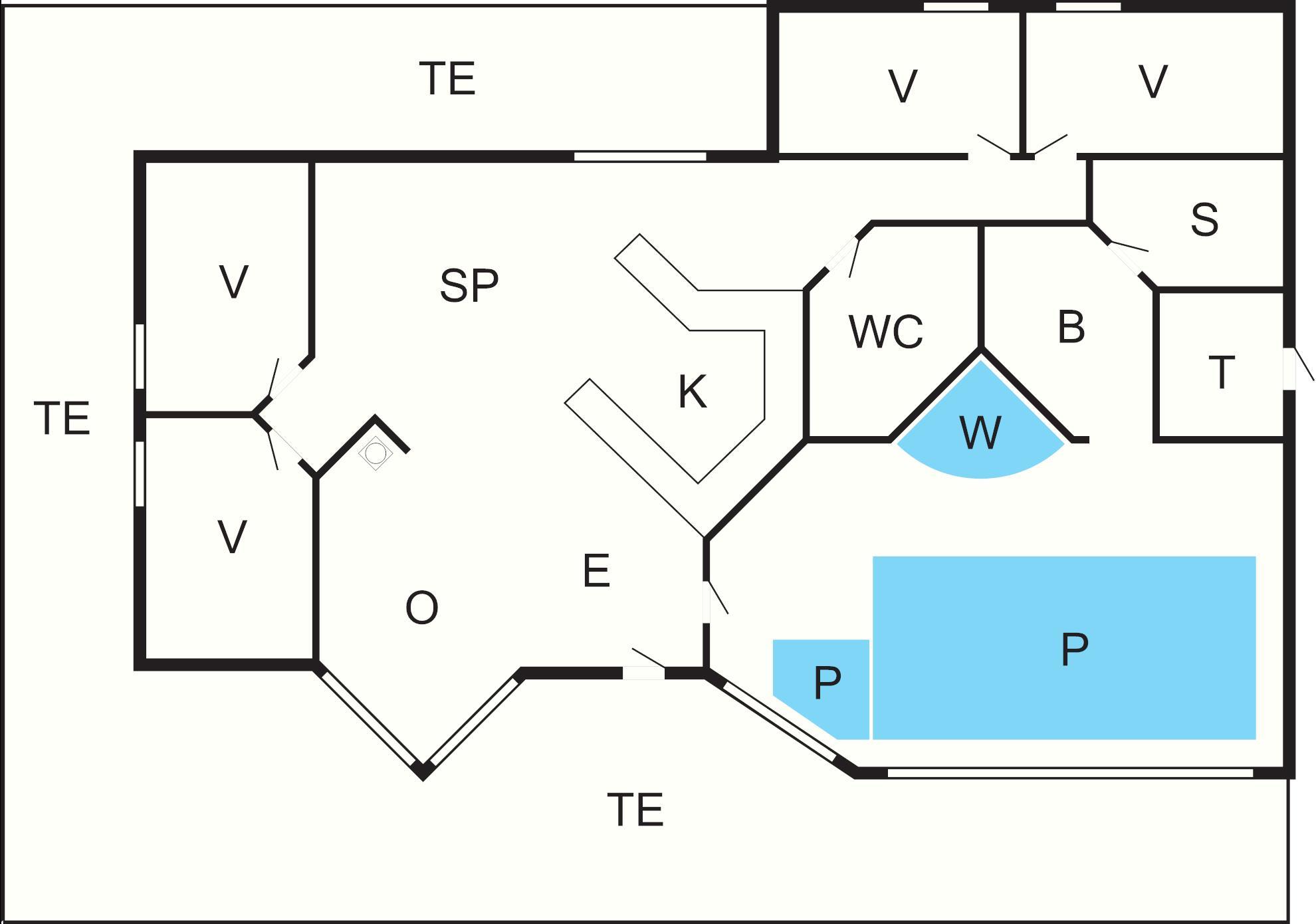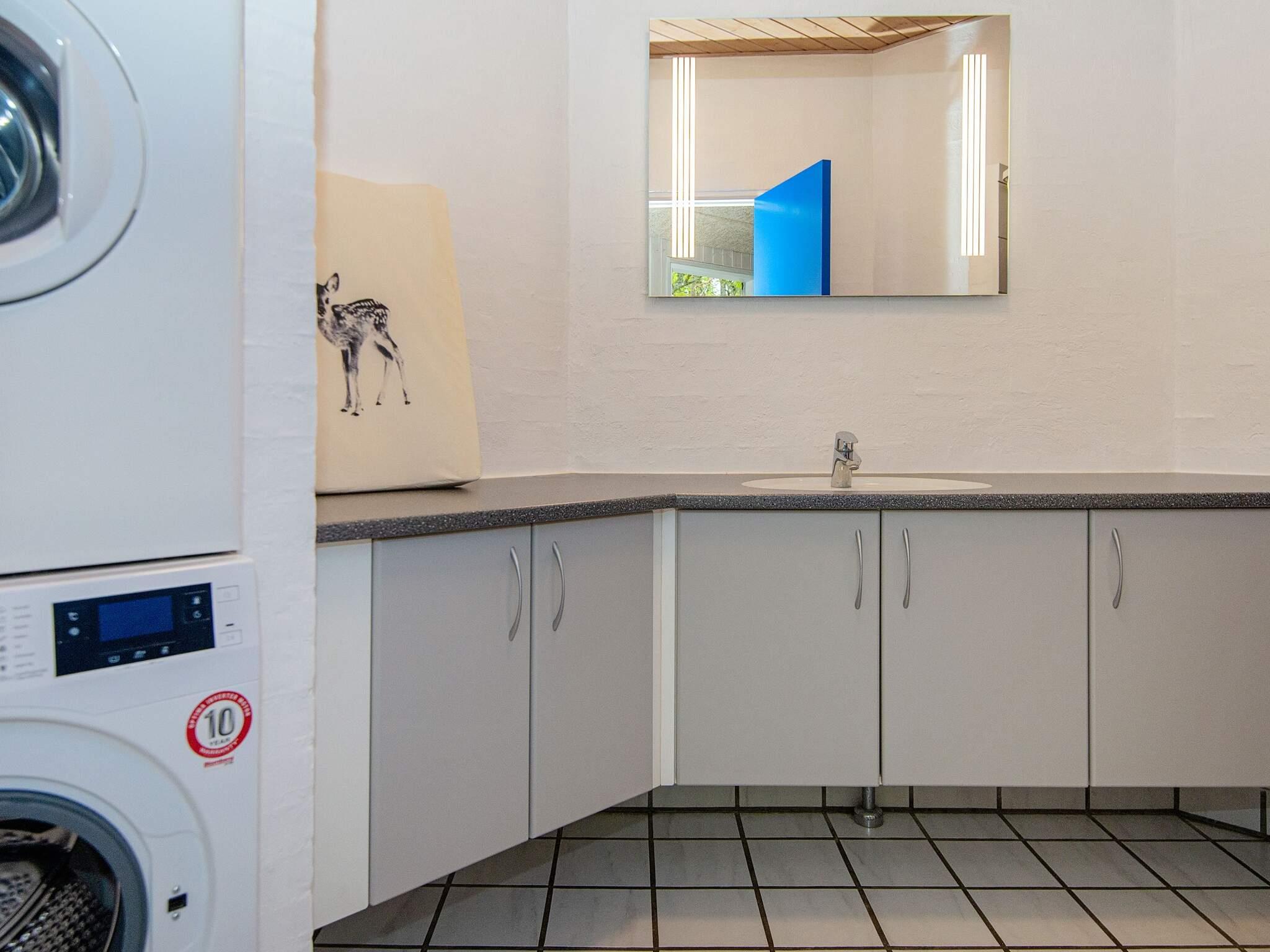 Husets poolafdeling indeholder swimmingpool (4,8 x 3,1 x 1,3 m) med børnepool, 2-personers spabad og et stort badeværelse med bruseniche og gulvvarme. Fra badeværelset er der adgang til saunaen. Huset indeholder endvidere endnu et badeværelse med bruseniche, gulvvarme, vaskemaskine og tørretumbler.
