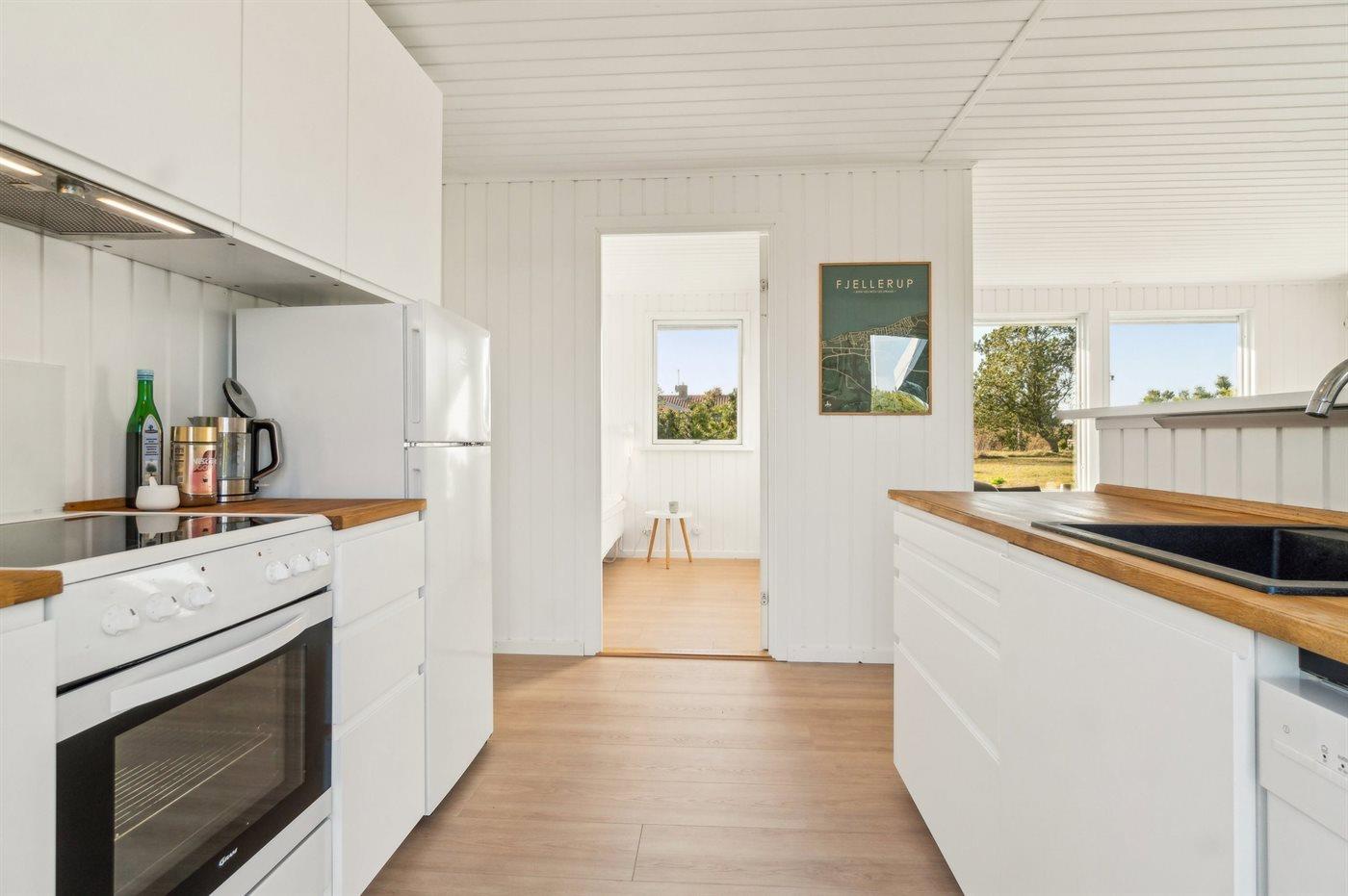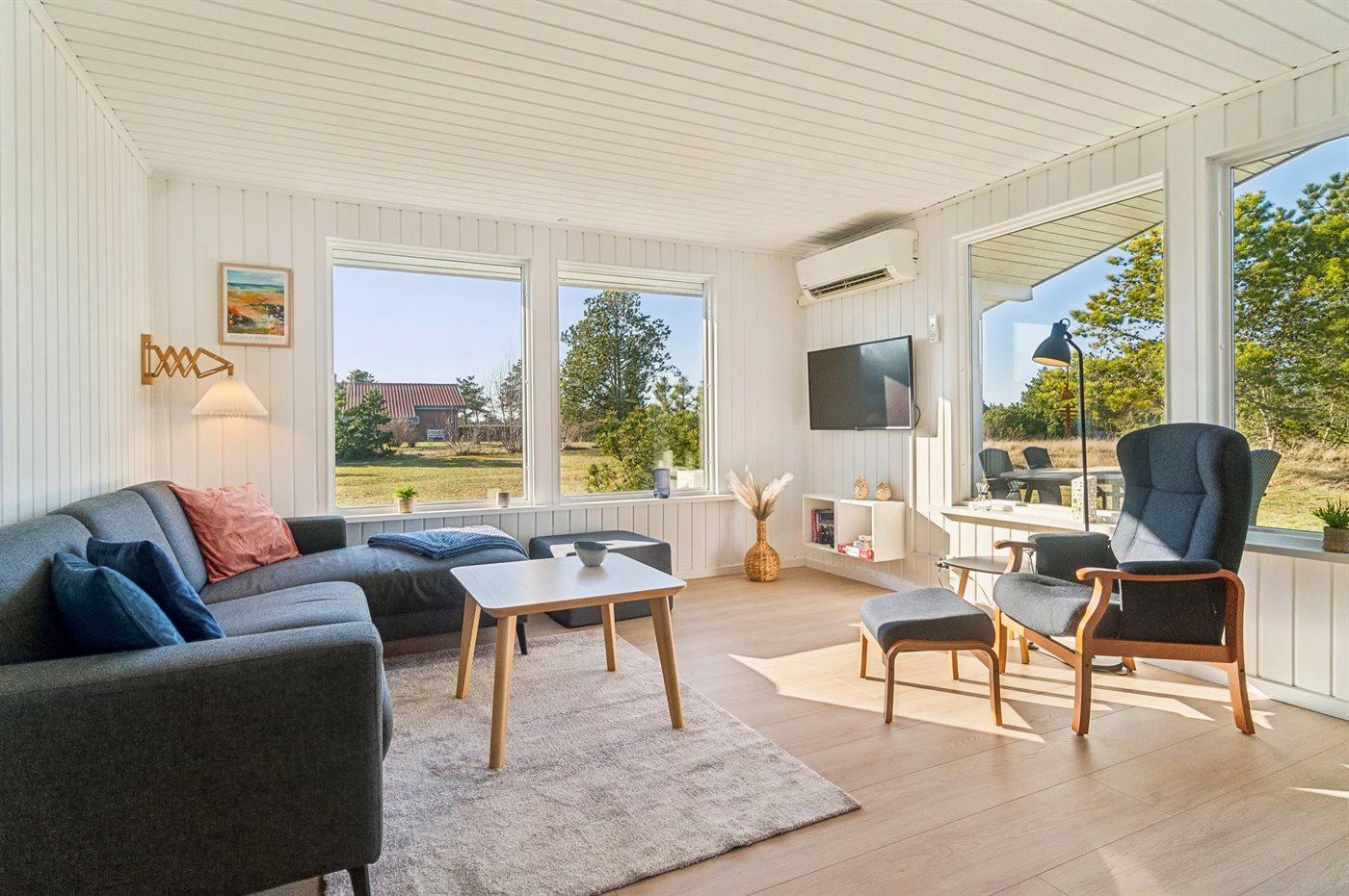 Indvendig fremstår sommerhuset lyst og moderne med en god indretning, som passer rigtig fint til f.eks. en familie med børn, og her er mulighed for at invitere bedsteforældrene med på ferie. Husets midtpunkt er det skønne køkken-alrum, som er kombineret med opholdsstuen, hvor de mange vinduer giver et virkelig godt lysindfald. Der er fra stuen direkte adgang til terrassen.