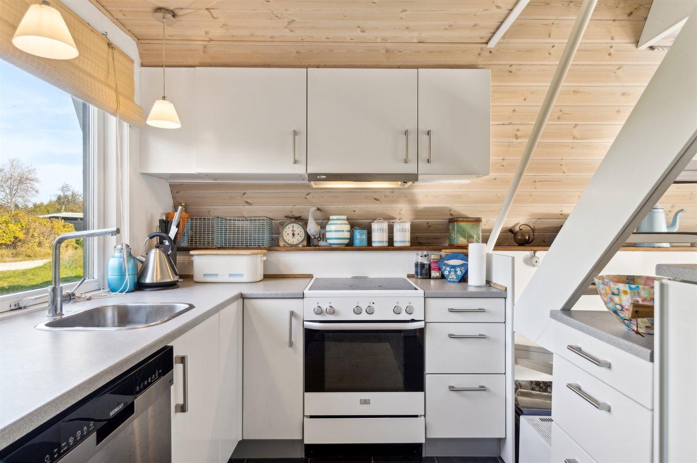 Køkkenet er udstyret med 1 køleskab. Der er 4 keramiske kogeplader, varmluftovn, mikrobølgeovn samt opvaskemaskine.