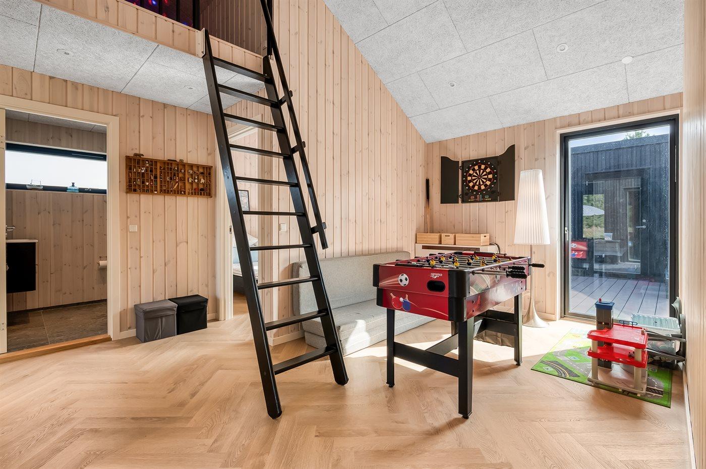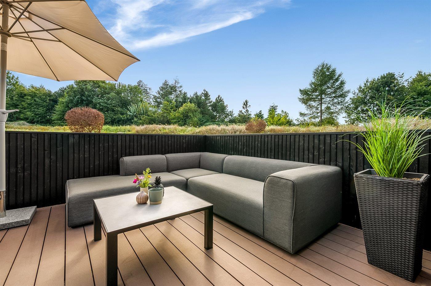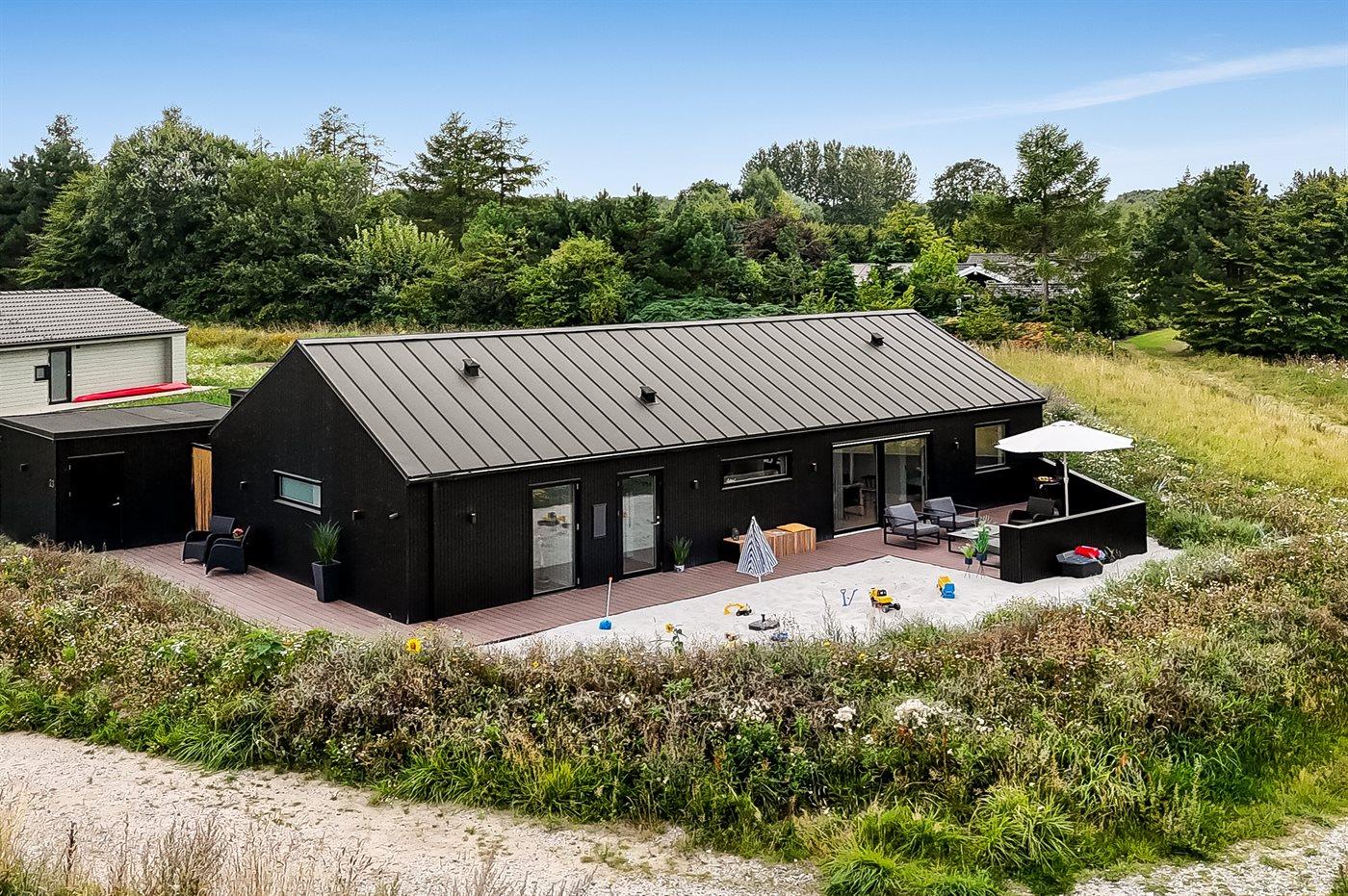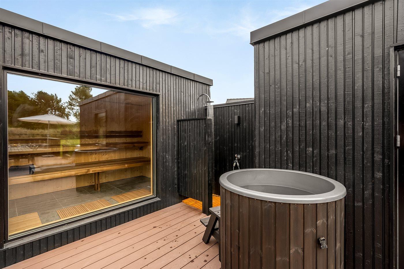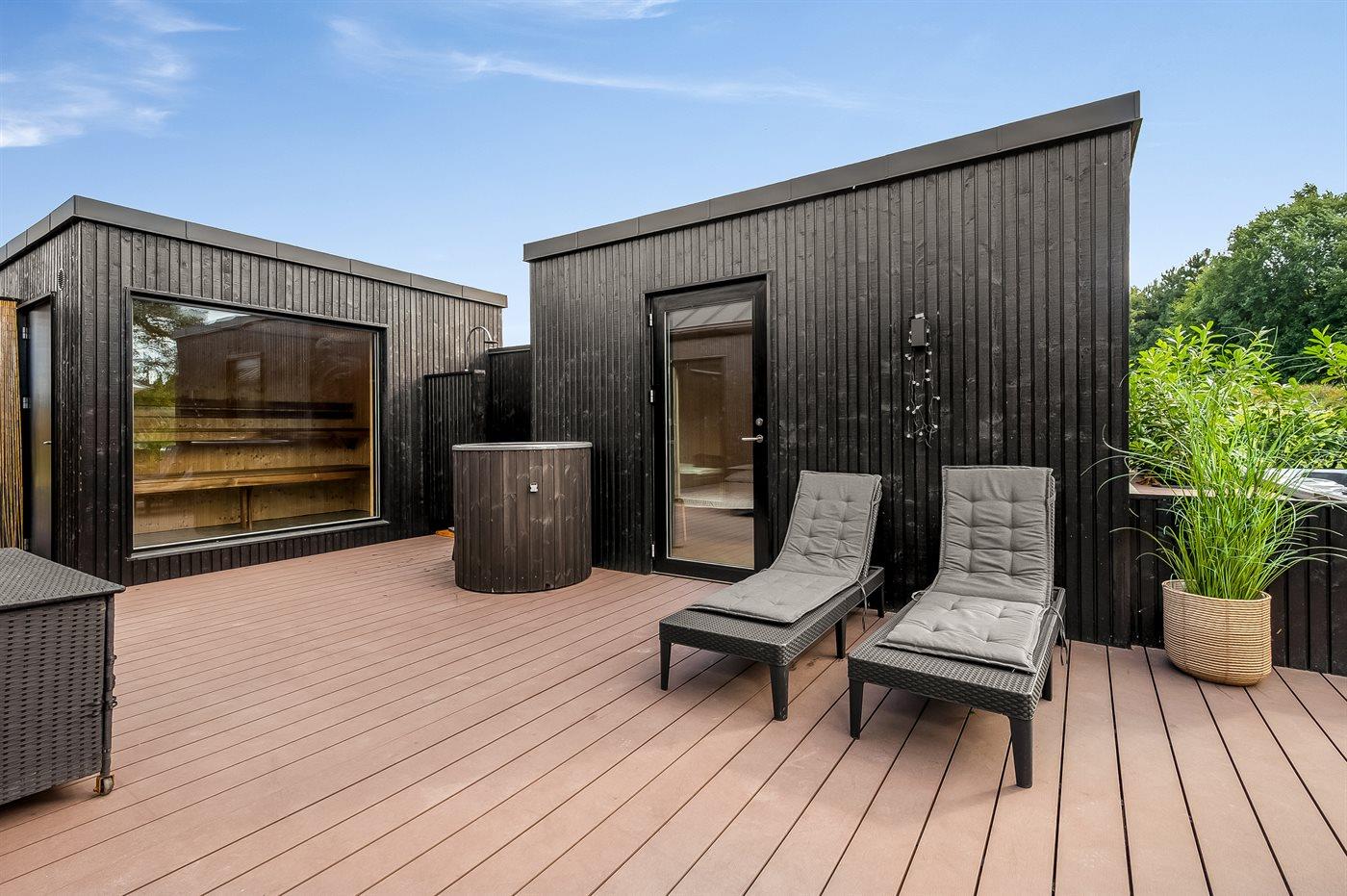 Sommerhuset tilbyder nogle fantastiske udearealer. Dette er lige fra den store sandkasse på forsiden af huset, hvor der er rig mulighed for leg, til det helt fantastiske terrassemiljø på havesiden af huset. Her findes et stort og lækkert spabad med plads til 7 personer, hvor det er helt oplagt at sidde og nyde det varme vand og omgivelserne. Der findes også et koldtvandskar og en stor udendørs sauna, som er dimensioneret til saunagus, og hvorfra den ugenerte beliggenhed og skoven i baggrunden kan nydes. Alt i alt sætter dette dejlige sommerhus rammerne for en perfekt ferie for hele familien, hvor der ikke er overladt noget til tilfældighederne.