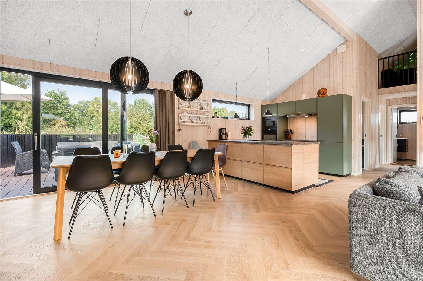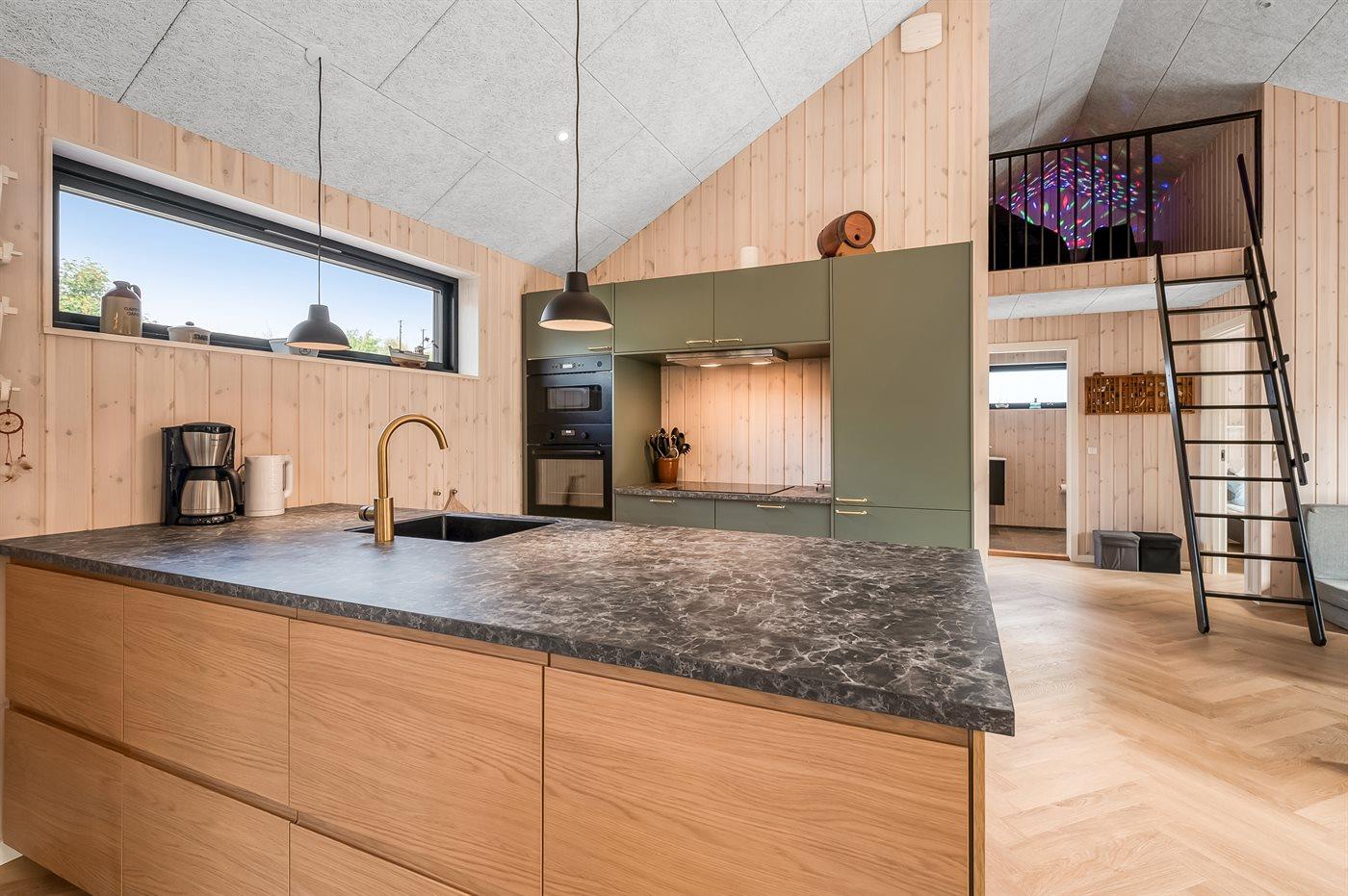Køkkenet er udstyret med 1 køleskab. Der er 4 induktionskogeplader, varmluftovn samt opvaskemaskine.