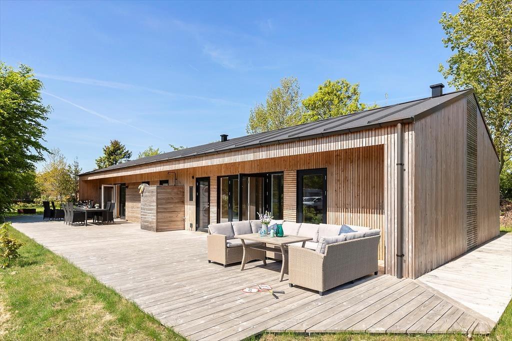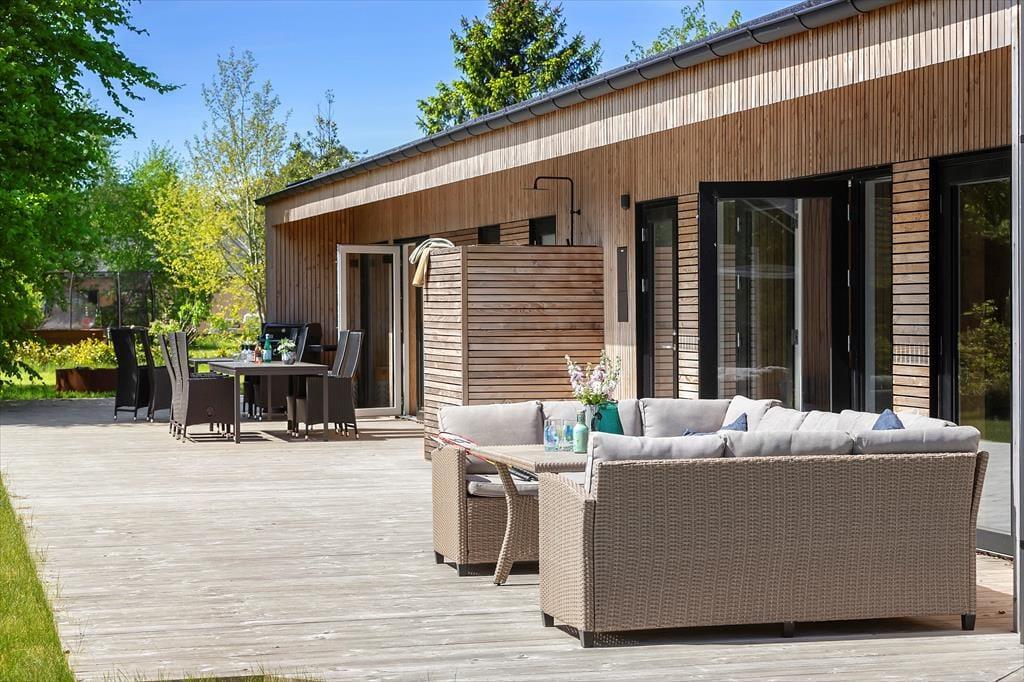 Den skønneste terrasse, hvor udelivet kan nydes i fulde drag og dejlig have med sandkasse, gynge og trampolin, som børnene kan muntrer sig med. Her er udebruser og god plads til at lade bilen. Kun 350 meter til en børnevenlig badestrand, hvor du kan nyde strandlivet på alle årstider.