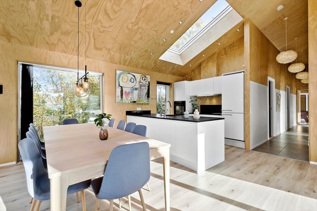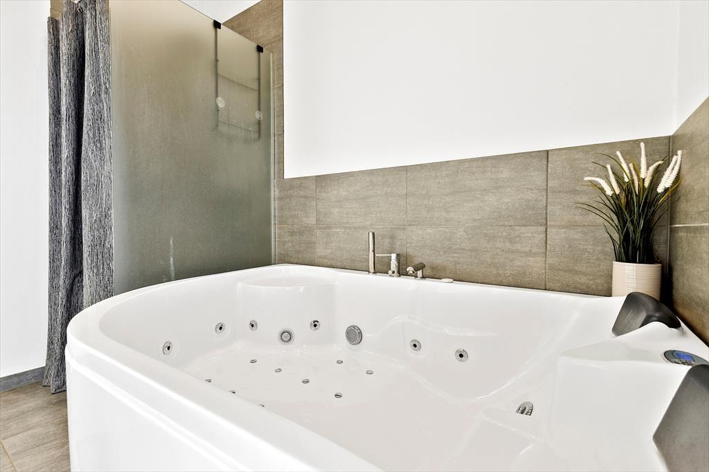 til dette luksuriøse feriehus, der har alt, hvad du behøver for en uforglemmelig ferie. Nyt og moderne feriehus fra 2021, der har god stil, smart indretning og hyggelig atmosfære. Huset har plads til 10 personer og byder på en række fantastiske faciliteter. To lækre og komfortable badeværelser - det ene med indendørs spa, hvor du rigtig kan slappe af og lade hverdagen smelte væk. Fem soveværelser - alle med gode dobbeltsenge. To af soveværelserne og det ene badeværelse ligger i den ene ende af huset og støder op til aktivitetsrum, der er veludstyret med billard, bordtennis og air-hockey. Så du kan roligt dyste og have det sjovt, uden at forstyrre de som nyder freden, spaen og det dejlige køkken/alrum og stuen med TV i den anden ende af huset. Gulvvarmen sørger for, at der er dejligt lunt i hele huset. Godt bryggers med vaskemaskine, tørretumbler og god plads til at køre en barnevogn ind, gør det nemt at hold ferie med de små.
