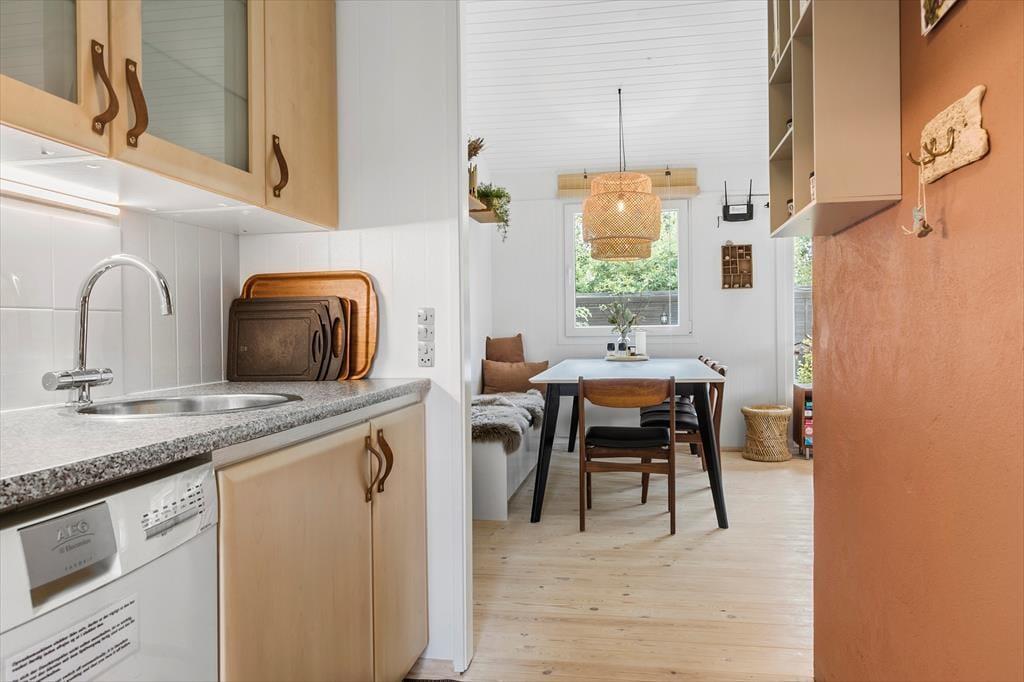 Som du åbner døren, bliver du mødt af en varm og indbydende atmosfære. Stuen, køkkenet og spisekrogen smelter sammen i ét stort rum, hvor lyset strømmer ind fra de store vinduer og skaber en lys og luftig fornemmelse. Her er plads til, at alle kan samles – om det så er foran brændeovnen på en kølig aften, hvor flammerne danser og spreder varme, eller omkring spisebordet, hvor duften af frisklavet mad breder sig fra køkkenet, mens du og dine nærmeste deler dagens oplevelser. Fra stuen er der dør til fantastisk terrasse og den skønneste have.