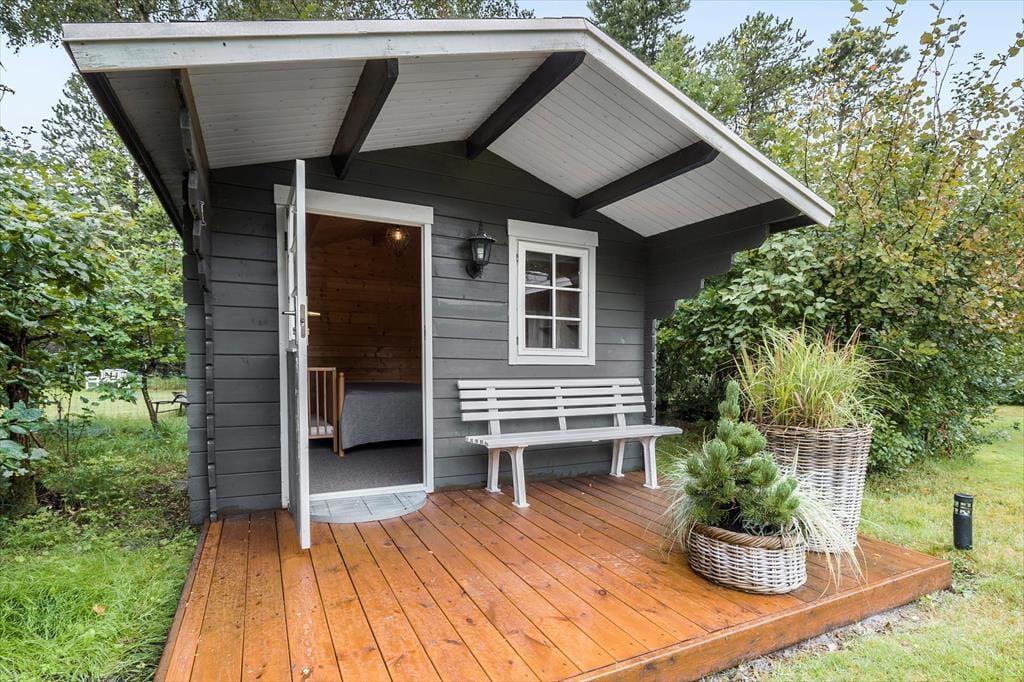 Udenfor, lige over græsplænen fra huset, finder du et charmerende anneks. Her ligger det fjerde soveværelse, perfekt til dem, der ønsker lidt ekstra privatliv. Annekset er ligesom huset indrettet med fokus på komfort og hygge, og den lyse indretning gør det til en oase af ro.