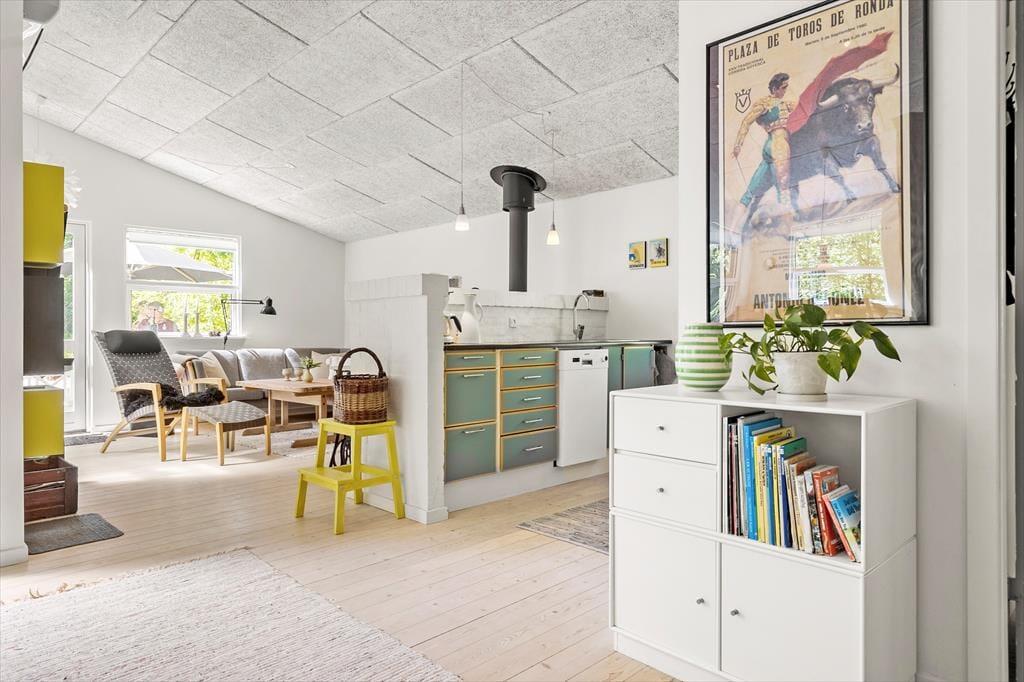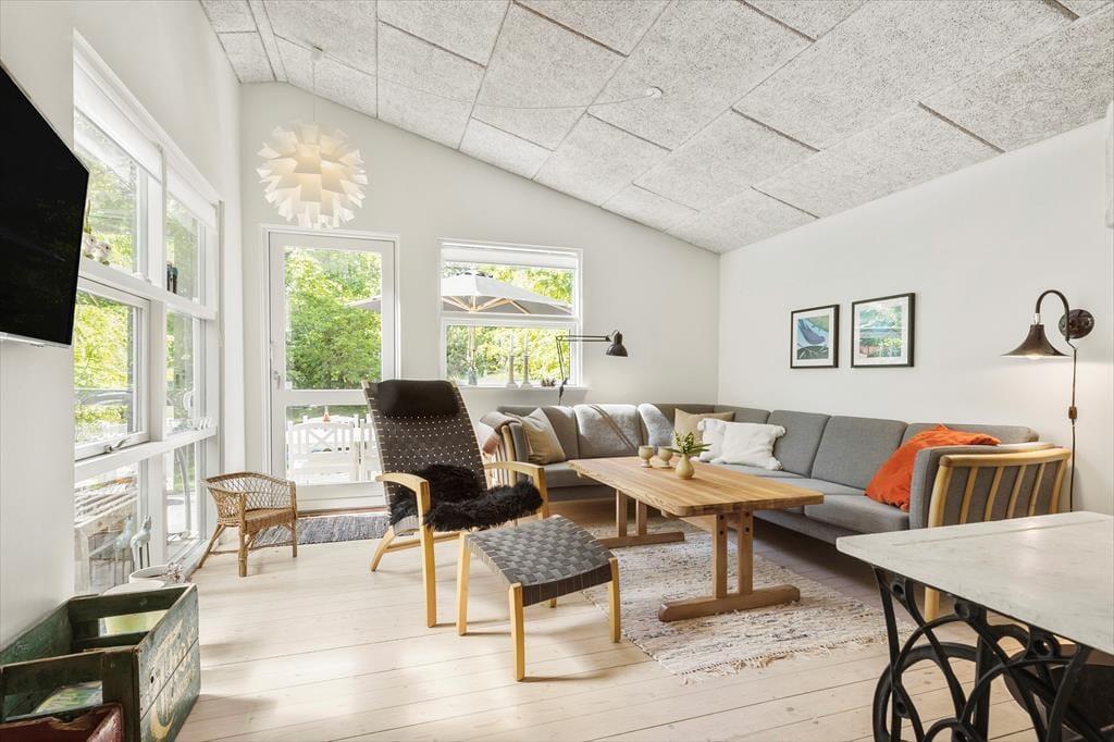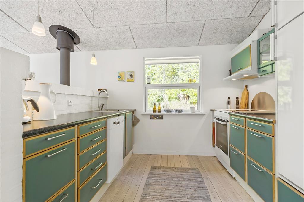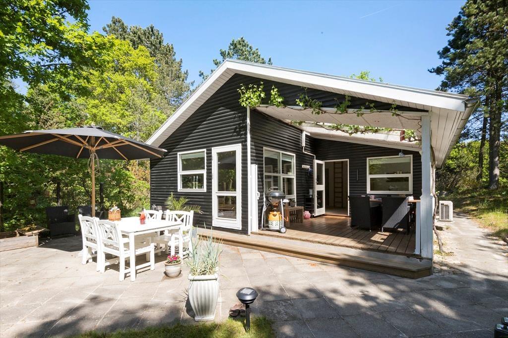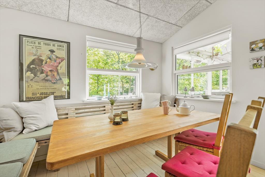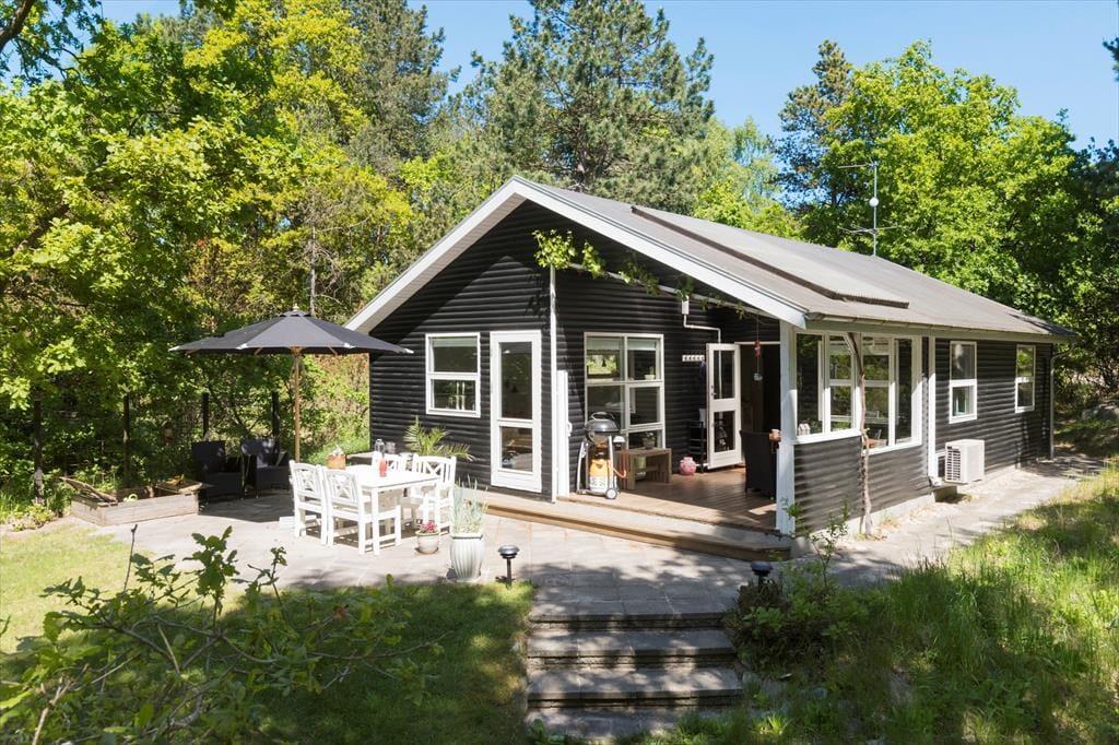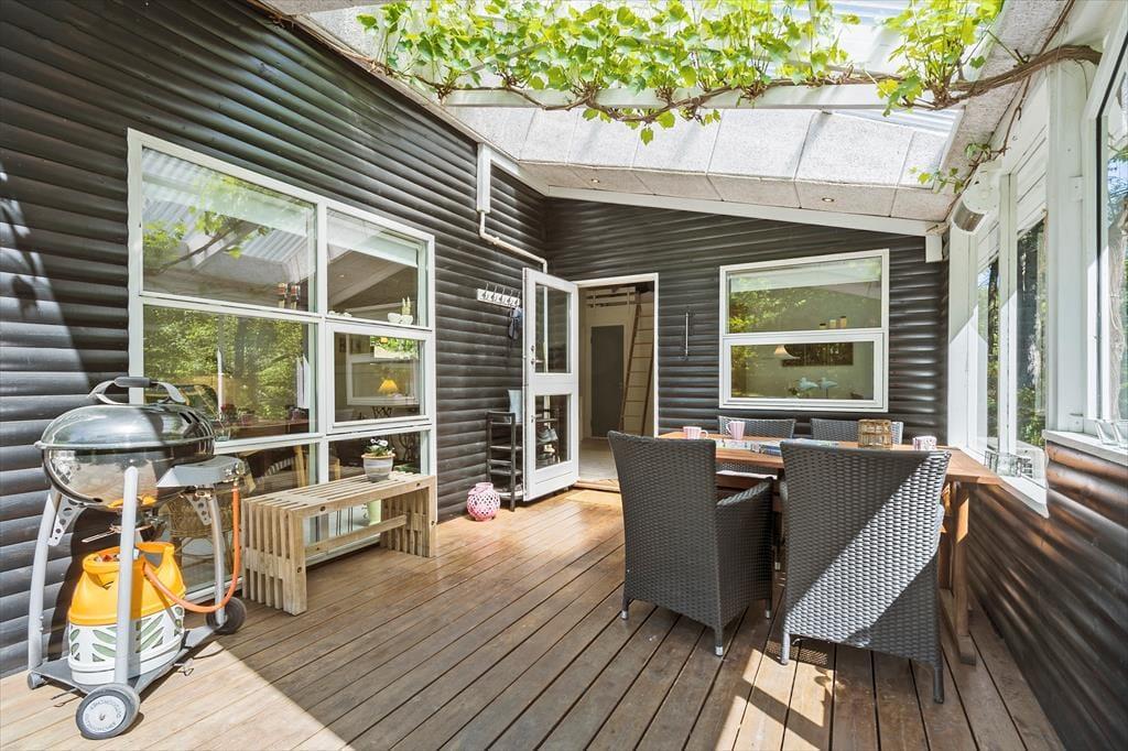Velkommen indenfor I den dybe, tætte skov gemmer dette sommerhus sig blandt træernes grønne løv. Det er et sted, hvor hvert hjørne oser af hygge og varme, og hvor naturens nærvær føles som en kærkommen omfavnelse. På verandaen breder sig en atmosfære af afslapning og samvær, med en terrassevarmer og et læhegn, der skaber en behagelig kokon, så du kan sidde ude længe. Over hovedet svajer vinrankerne og giver en følelse af at være på en sydlandsk terrasse midt i den danske skov. Køkken med sommerhusstemning og et strejf af landlig idyl. Her kan du tilberede dejlig feriemad, mens du holder øje med de mindste og sludrer med de ældste. I stuen danser flammerne fra brændeovnen, og i hjørnet er spisekrogen med rustik slagbænk, hvor du kan nyde maden med udsigt til den fortryllende skovgrund udenfor. Sommerhuset byder på to hyggelige soveværelser - begge med dobbeltseng og en sovehems, hvor du kan lade drømmene flyve frit under det skrå loft. Badeværelset er indrettet med alt, hvad du behøver for at føle dig velkommen og komfortabel.