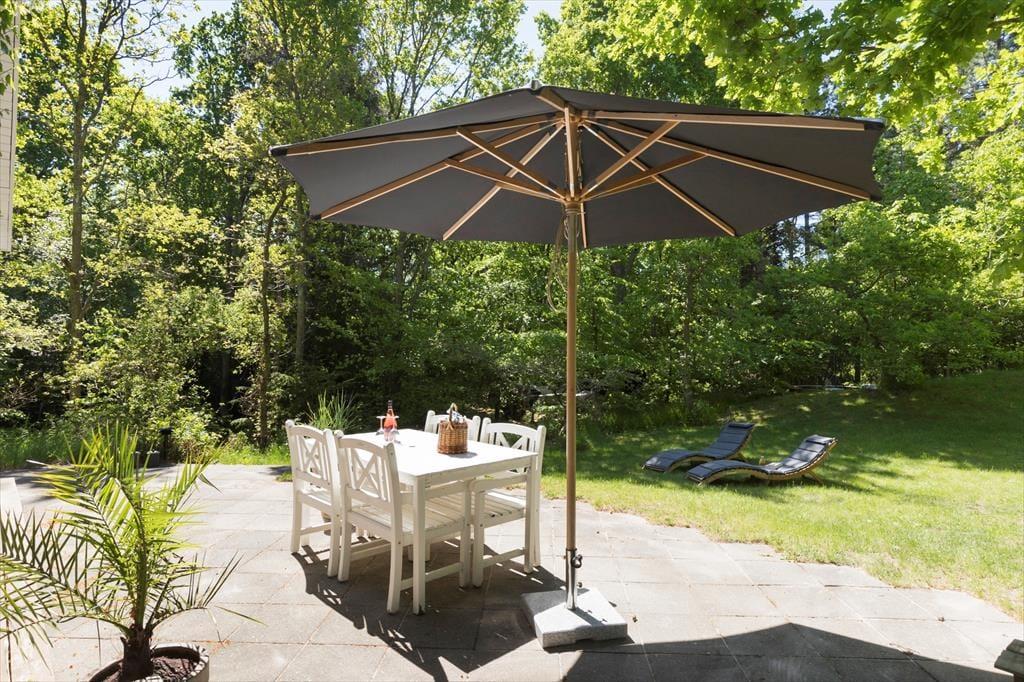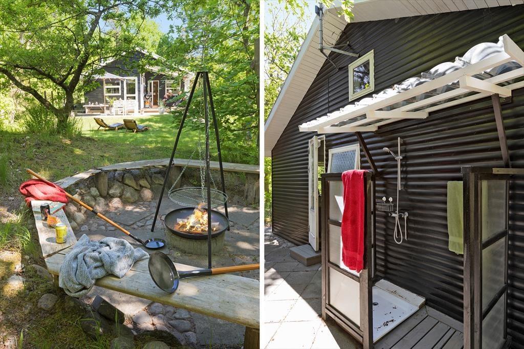 Nyd livet udenfor Den kuperede skovgrund strækker sig som en uendelig oase af eventyr. Her er græsset vildt og frodigt og kun en lille del af det bliver klippet, så naturen har frit spil her med et smukt resultat. En bålplads inviterer til hyggelige aftener under stjernerne, mens skovens dufte og lyde omgiver dig, ilden knitrer og du griller skumfiduser eller bager pandekager. Svalt hjørne med sandkasse og når du trænger til at forfriske dig, kan du nyde et brusebad i udebruseren under åben himmel og midt i skoven.