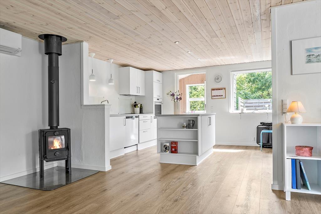 Velkommen indenfor: Dette er hjertet af den gamle del af Fjellerup Strand, hvor du finder dette charmerende sommerhus – et paradis for dem, der søger fred, afslapning og samvær med familien. Sommerhuset, i sin bedste alder, byder på en atmosfære af varme og hygge. Det åbne samtalekøkken er hjertet i hjemmet, hvor madlavning bliver en fælles oplevelse. Køkkenet er i åben forbindelse stuen, hvor der er hyggelig spisekrog, hvor familien kan samles om måltiderne og dele dagens oplevelser og slutte af i ”de bløde”, hvis det ikke er terrassevejr. Badeværelset er rummeligt og praktisk indrettet med vaskemaskine og en pusleplads. Den separate soveafdeling med 3 soveværelser er ideel til familier med børn. To af værelserne er udstyret med dobbeltsenge, og i det ene er der også en barneseng. Det tredje værelse har to enkeltsenge. Huset spil og krammebamser giver hygge og underholdning for hele familien. Dette sommerhus i Fjellerup Strand er et sted at leve, grine og skabe minder, der varer livet ud. Her kan du og din familie nyde ferien i en fin ramme, hvor naturen og hyggen går hånd i hånd.