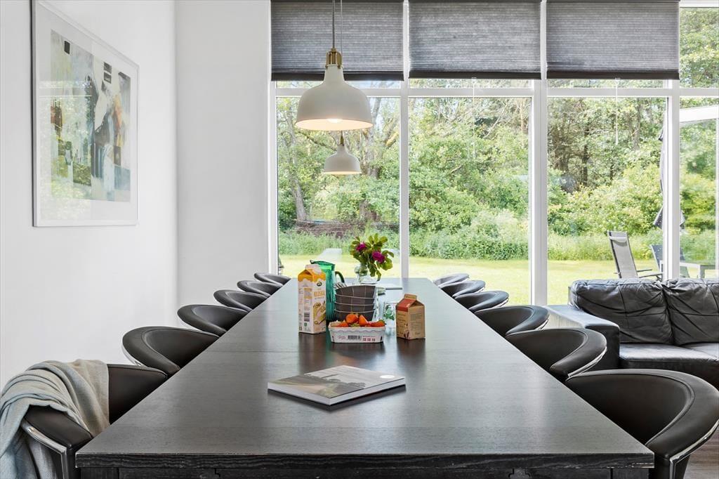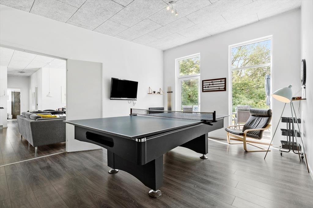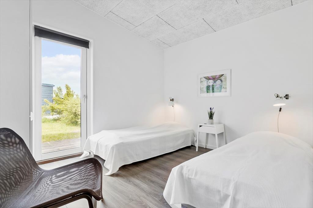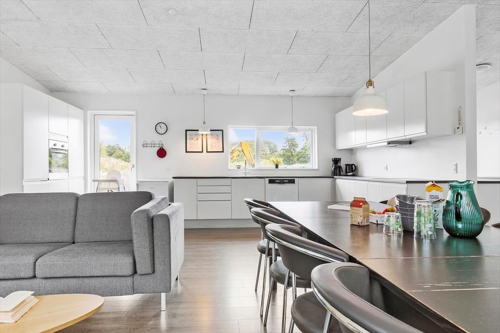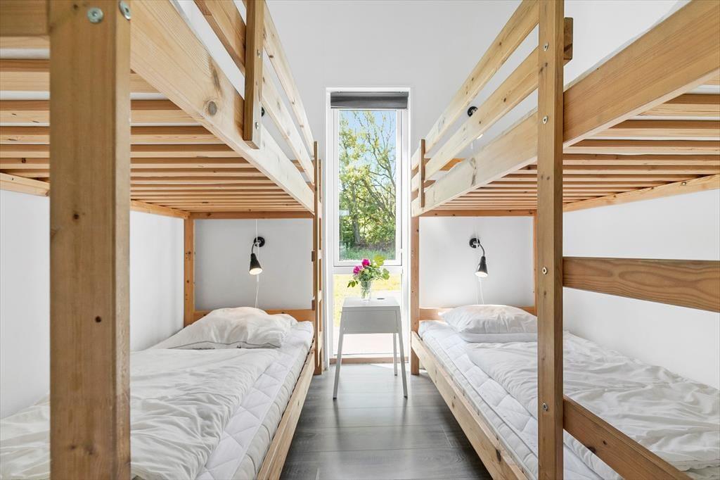 Et moderne træsommerhus fra 2016, der er klar til at tage imod dig og din familie og venner, når I skal hygge jer. Når I træder ind, bliver I mødt af en rummelighed, der forsikrer jer om, at det er et hus, der er rart at være mange i. Det store køkken/alrum er stedet, hvor madtryllerier sker og hyggelige middage finder sted, mens tv-hjørnet lokker med afslappende filmstunder og måske en lille lur. Når konkurrencelysten begynder at boble i jer, står aktivitetsrummet klar. Her kan I udfordre hinanden i spændende bordtenniskampe og intense pool turneringer. Sommerhuset rummer hele fem soveværelser - fire med enkeltsenge, der kan skubbes sammen til dobbeltsenge, samt et køjeværelse med fire køjer, perfekt til børnene og de af jer, der føler jer unge nok til at kravle i overkøjen. To moderne badeværelser, hvoraf det ene er udstyret med en lækker spa, hvor I kan "boble løs" og slappe af.