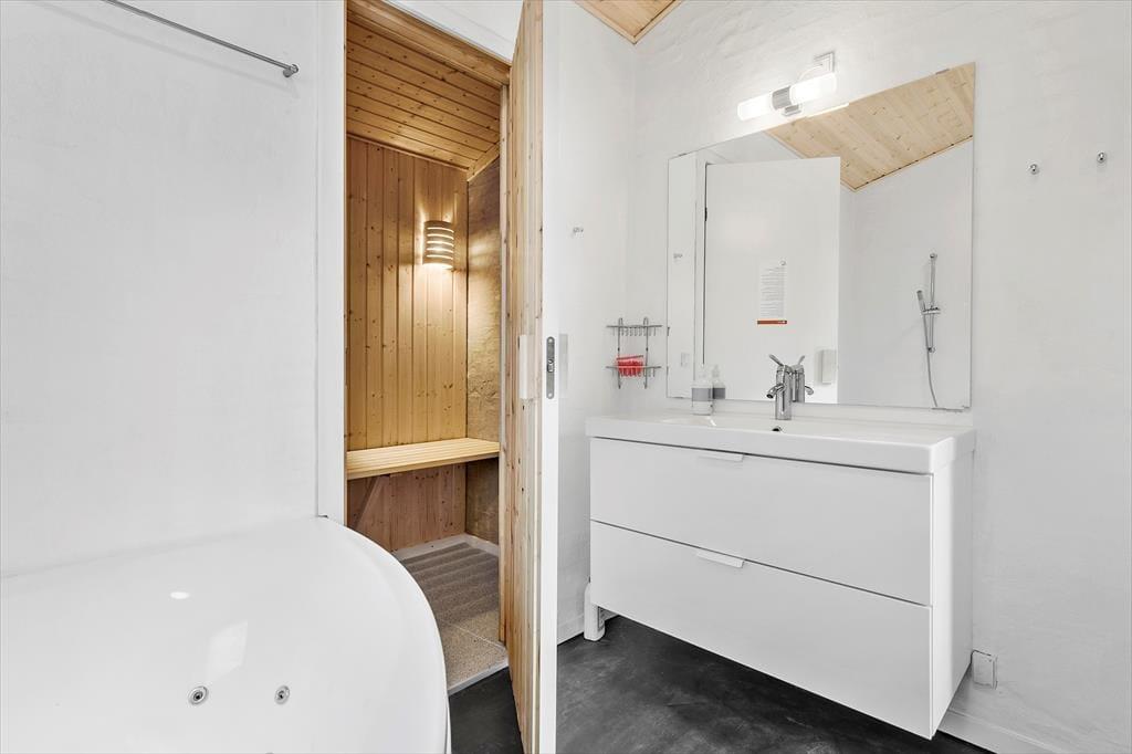 Velkommen indenfor: Moderne sommerhus fra 2022 - Indretningen og rumfordelingen er godt gennemtænkt og sommerhuset stråler af skandinavisk hygge og funktionalitet. De flotte epoxygulve og de høje lofter skaber en lys og rummelig atmosfære. Du bliver budt velkommen i en praktisk bryggers, hvor der er plads til, at du kan trille barnevognen ind for natten. Husets hjerte er det store fællesrum, hvor stue, køkken, alrum og børnenes legehjørne smelter sammen. Her kan alle være sammen og hver for sig. Brændeovnen i hjørnet spreder varme og hygge og du indtager terrassen og haven via terrassedøren i stuen. Drøm dejligt i fem gode soveværelser - Alle med dobbeltsenge og det ene sågar med en køje. 2 dejlige badeværelser - det ene med spa og sauna. Tag en afslappende spa og nyd boblerne og roen eller snut en tur i saunaen en kold efterårsdag - det er da livet.