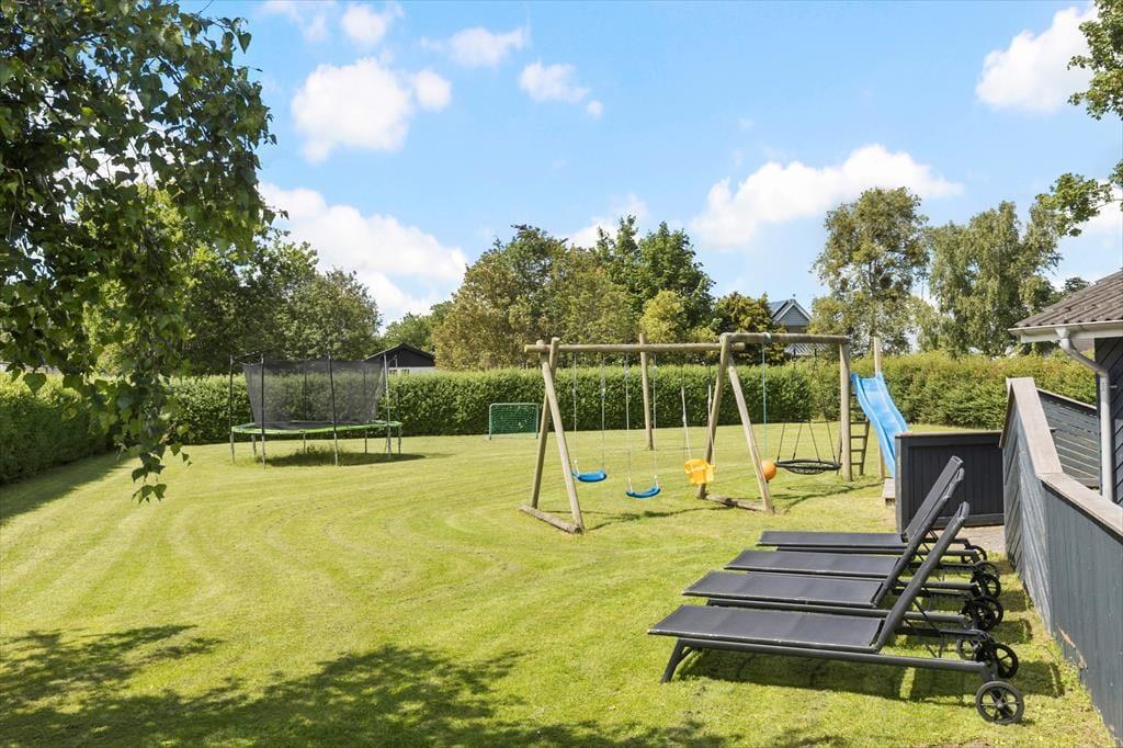 Nyd livet udenfor: Terrassen mod sydvest er ugenert, læ fyldt og delvist overdækket. Det perfekte sted at nyde sol og udeliv om dagen og spise lækker mad fra den duftende grill om aftenen. Børnene vil elske haven, hvor den store græsplæne med trampolin og gynger indbyder til leg, og hvor shelteren lokker med eventyrlige overnatninger i det fri. Når mørket falder på, kan I tænde op i bålstedet, riste skumfiduser og tale om dagens dejlige oplevelser. Bare 300 meter væk ligger den børnevenlige Fjellerup Strand, hvor I kan nyde solen, bygge sandslotte og lege i bølgerne. Snup en lækker isvaffel på vejen hjem.