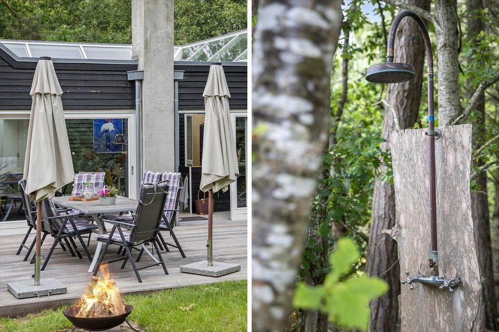 På den skønne grund folder feriestemningen sig for alvor ud. Her er masser af plads til både afslapning og aktivitet: Glæd dig til en stor, grøn græsplæne til boldspil og bare tæer, indbydende loungemøbler under store parasoller, duftende grillmad på terrassen og lange, lune sommeraftener, hvor latteren hænger i luften. Når mørket falder på, kan du riste skumfiduser over bålet, nyde solnedgangens smukke farver på himlen og lyden af ferie.