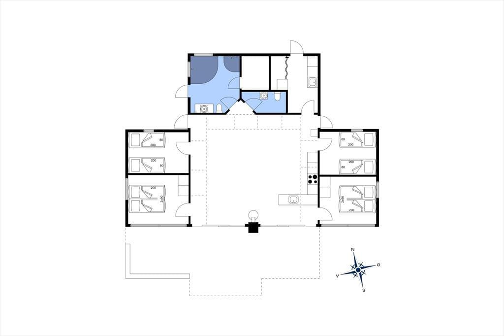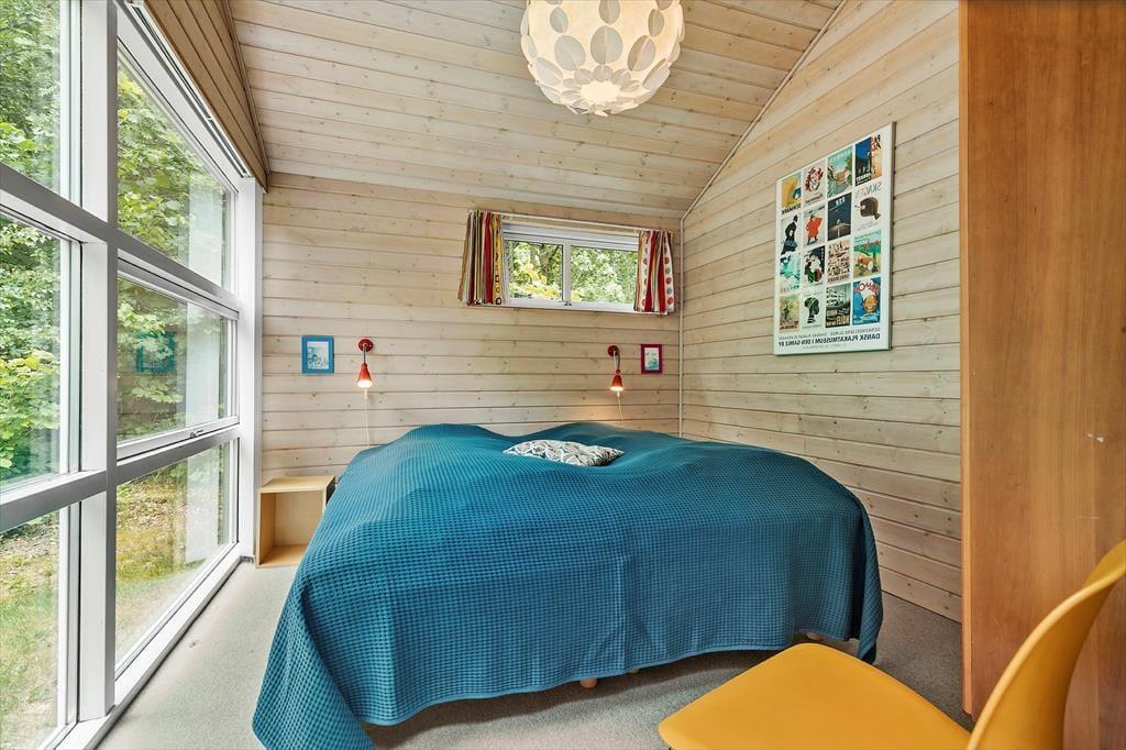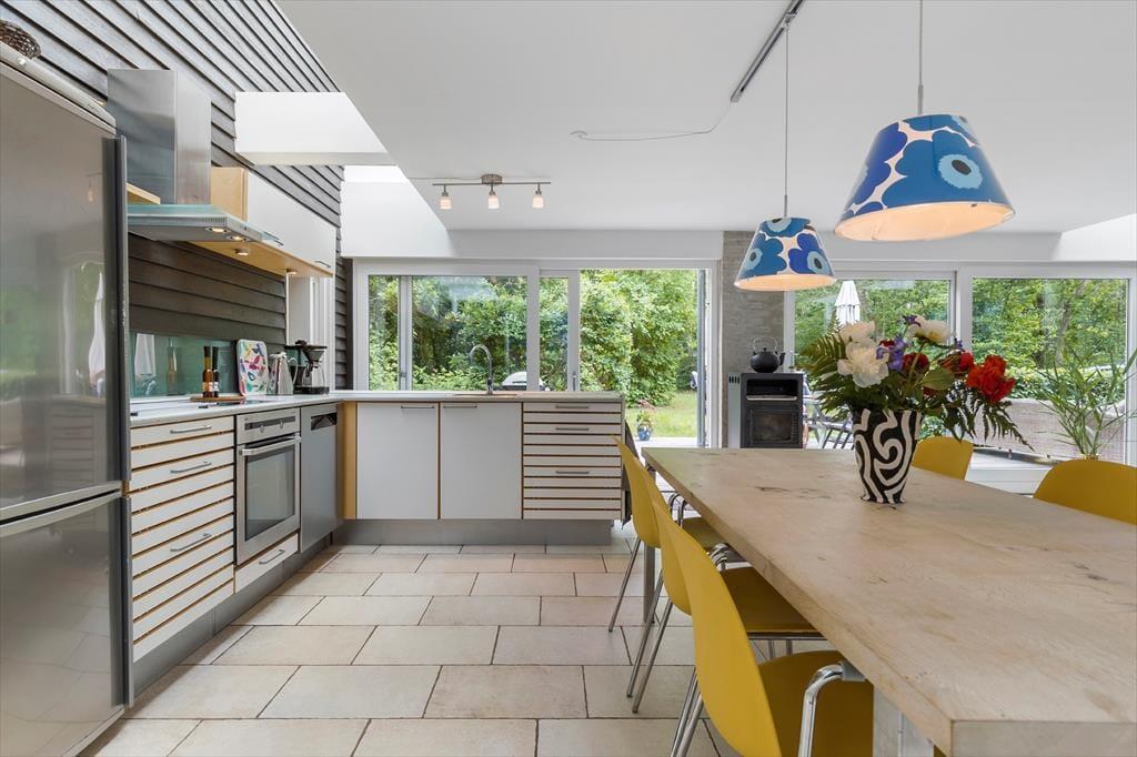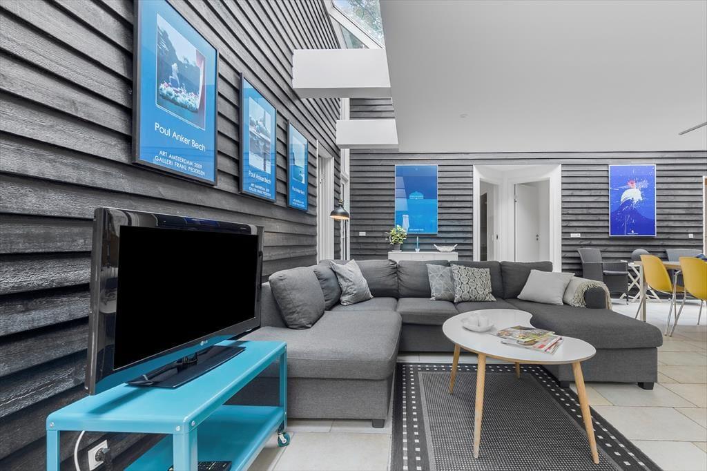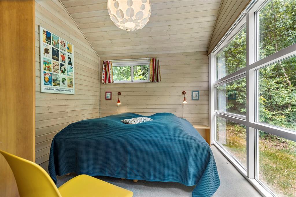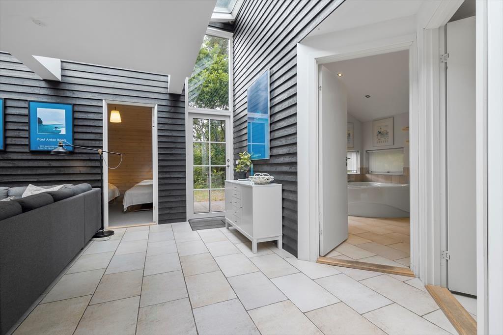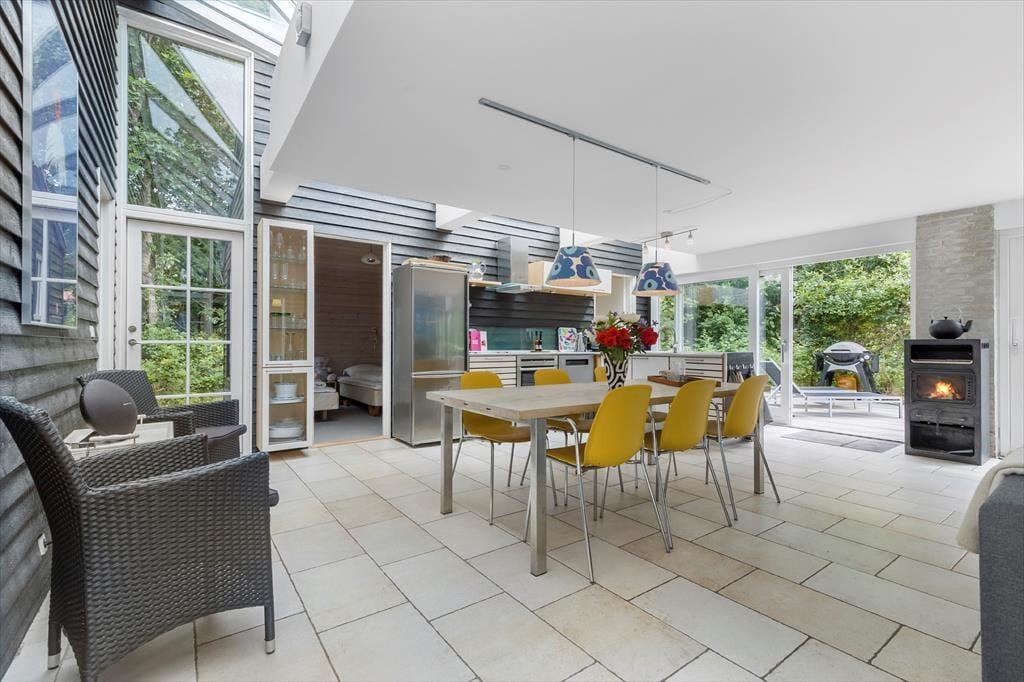Glæd dig til at træde ind i et helt særligt og arkitekttegnet sommerhus, hvor lys, farver og charme går hånd i hånd. Her er det rart at være – også når I er mange – og planløsningen inviterer til samvær og ro. Det store opholdsrum i husets hjerte er fyldt med lys fra de brede vinduespartier, som smukt trækker naturen med helt ind i stuen. Her finder du både stue, spiseplads og et lækkert, veludstyret køkken – alt sammen stilfuldt indrettet med fokus på hygge og fællesskab. Kække detaljer som den sorte, rustikke trævæg og de flotte, klare farver giver personlighed og kant. På hver side af opholdsrummet finder du to gode soveværelser – ét med dobbeltseng og ét med to enkeltsenge – altså i alt 4 soveværelser. Badeværelset har både spa og sauna, og der er desuden et ekstra gæstetoilet samt et praktisk bryggers til strandtasker og våde håndklæder.