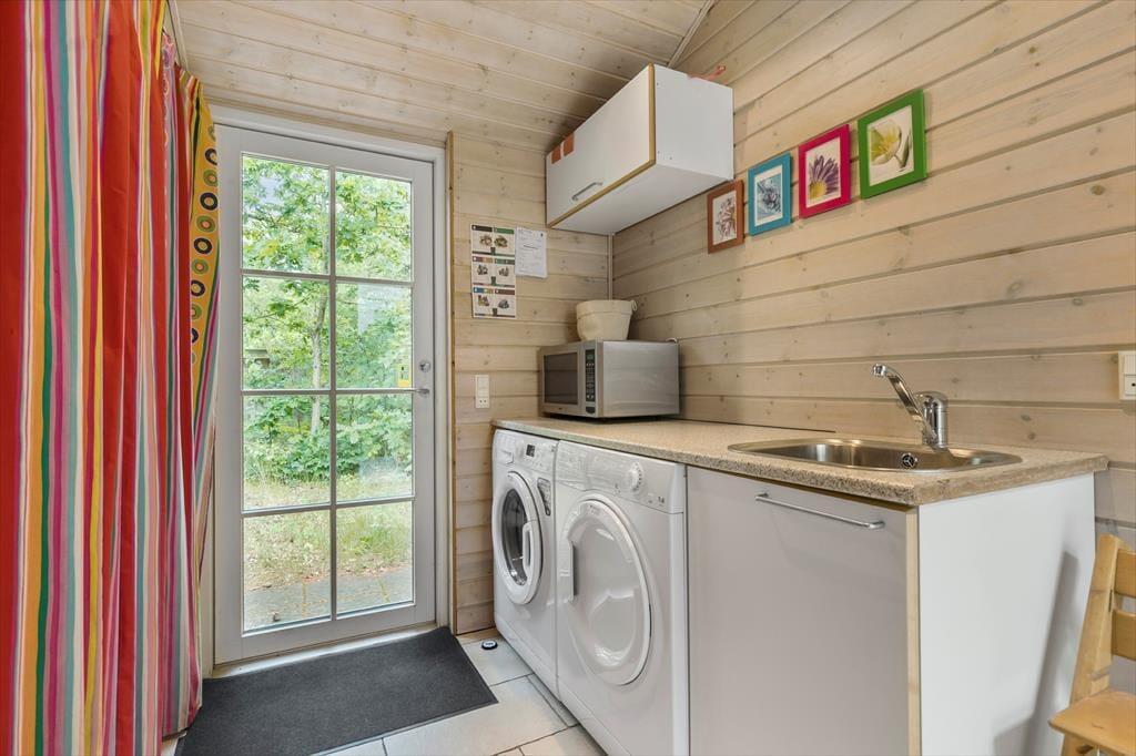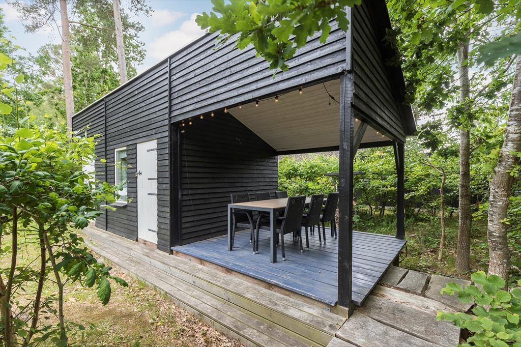 Den overdækkede terrasse forlænger udelivet – her kan du nyde morgenkaffen til regnens trommen på taget eller skærme dig for aftenduggen under et dejligt tæppe. Og med kun 300 meter til den børnevenlige Fjellerup Strand er det let at smutte frem og tilbage i løbet af dagen – måske for at hente solcremen, frokosten eller bare for at tage en velfortjent pause i det rare hus.