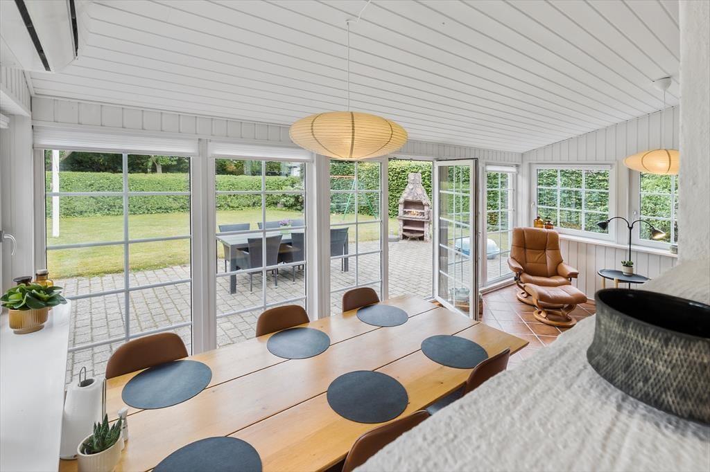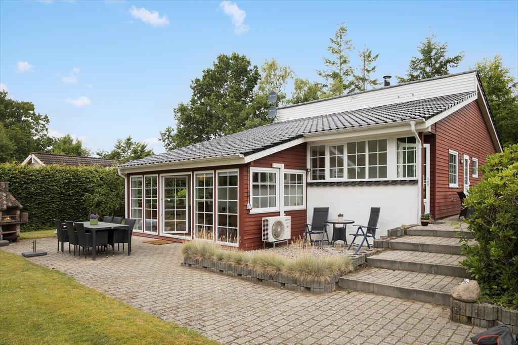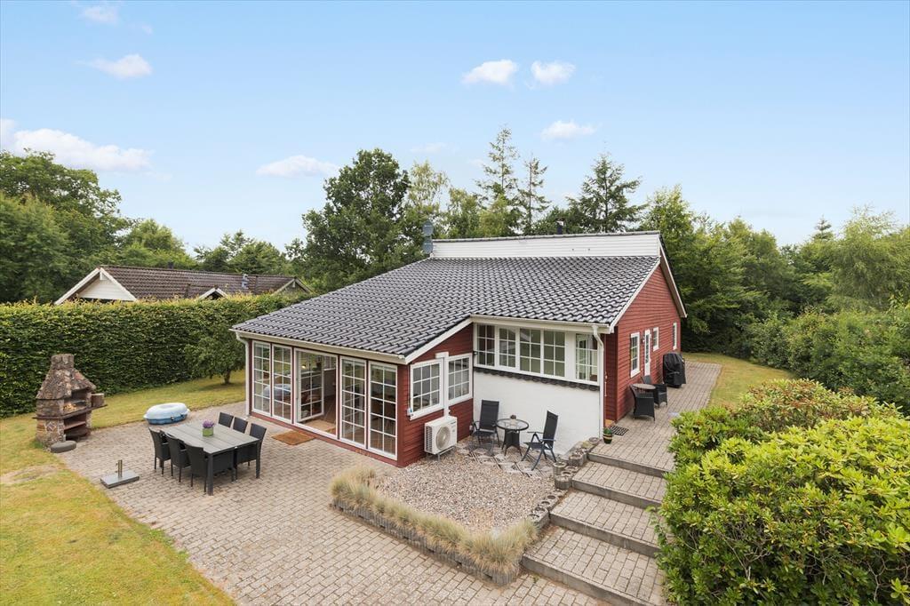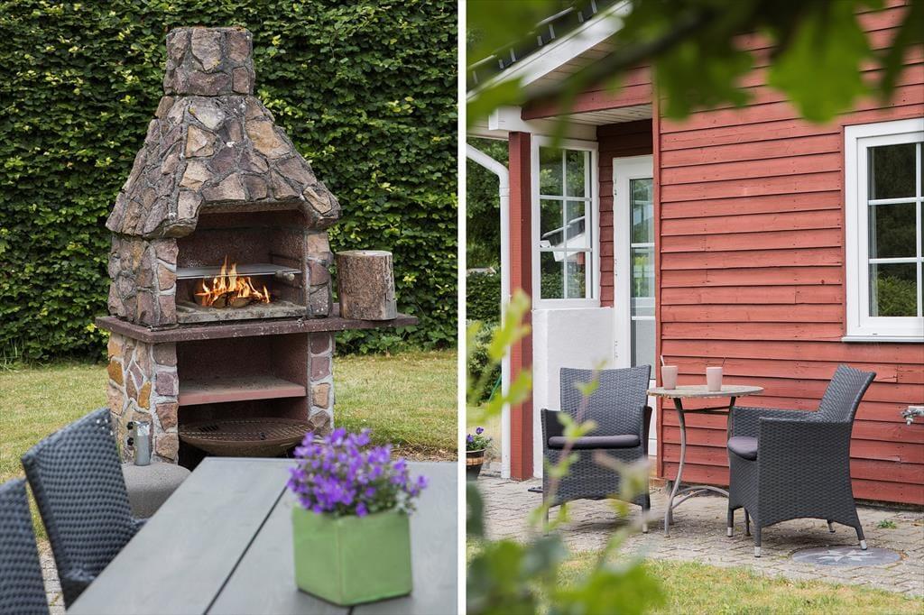Allerede ved ankomsten fornemmer I sommerhusets særlige charme – Sommerhuset står smukt og stolt med sin danske flagstang foran, klar til at danne rammen om feriedage fyldt med nærvær og danske traditioner. Grunden emmer af ro og feriestemning med en herlig have, hvor frodig bevoksning i skellet skaber privatliv og læ. Den store græsplæne inviterer til leg, boldspil og afslapning i solen, mens fliseterrassen bugter sig rundt om det meste af huset og giver masser af lækre spots til både morgenkaffen og aftensmaden under åben himmel. Her finder I også en udendørs pejs og et bålsted, som lægger op til lange, lune aftener med snobrød, gode historier og stjernekig. Rundt omkring i haven står flere hyggelige bænke – perfekte til en stille stund med en bog eller bare for at nyde ferieroen og fuglesangen. Og når I får lyst til en dukkert, er der kun 350 meter til den skønne badestrand – lige til at gå ned i klipklappere med håndklædet over skulderen.