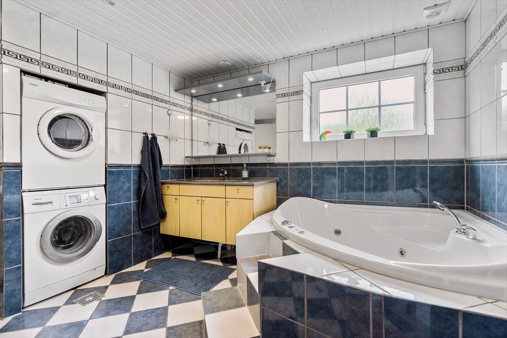 Sommerhuset rummer indbydende soveværelser, alle med dobbeltsenge og god skabsplads. Det ene værelse har direkte adgang til det store badeværelse, som også er tilgængeligt fra stuen – praktisk og fleksibelt. Badeværelset er indrettet med spa, bruser og vaskesøjle, så I kan starte dagen friske og afslutte den med forkælelse.