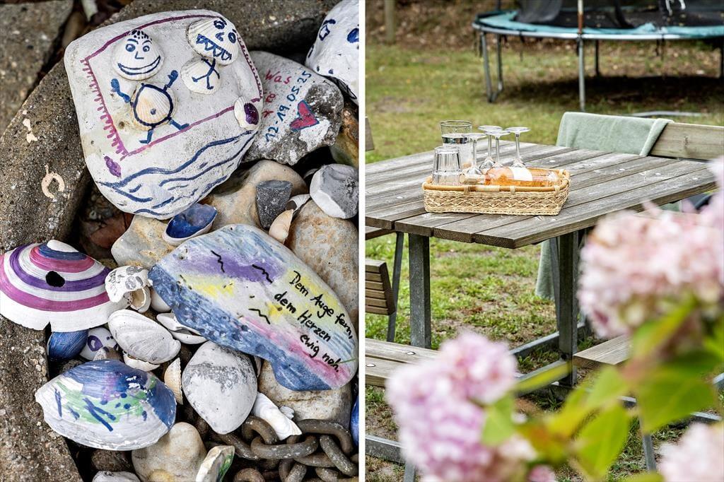 Huset ligger på en dejlig grund med både græsplæne og fliseterrasse, der omgiver det meste af huset. Høje, smukke træer i skel skaber privatliv og ro, mens børnene kan more sig på trampolinen eller klatretårnet med gynger og rutschebane. For de voksne er der gode siddepladser på begge sider af huset og grillen står klar til lækre feriemåltider og hygge under åben himmel.