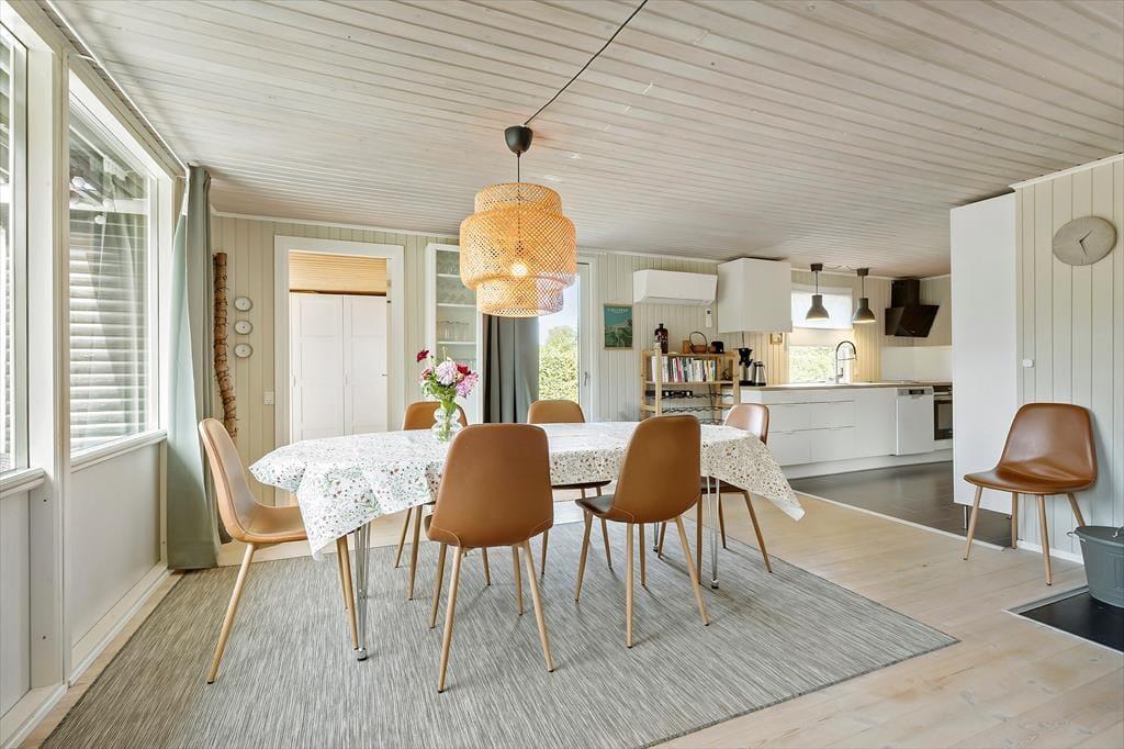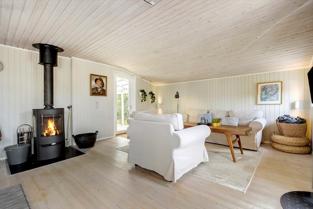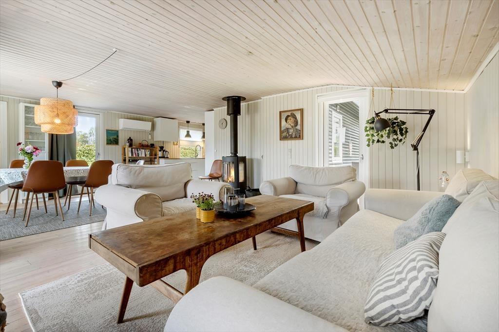 Velkommen indenfor i dette dejlige sommerhus, som danner rammen om en uforglemmelig ferie omgivet af smuk natur og den skønne strand. Indretningen er lys, komfortabel og hyggelig, og hele huset emmer af feriehygge. Køkkenet er veludstyret, så både store og små kan tage sig god tid til at tilberede familiens livretter. Måltiderne kan nydes ved spisebordet eller på en af husets tre terrasser. Stuen er virkelig hyggelig med et dejligt spisebord og en afslappende sofagruppe, hvor I kan nyde både brændeovn og TV.