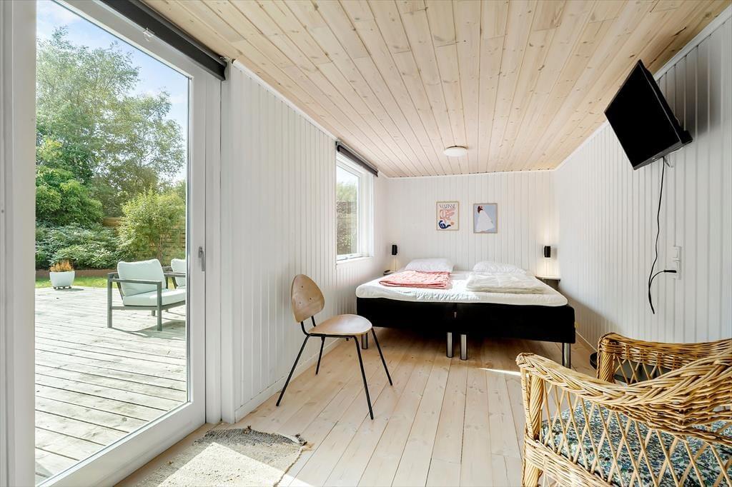 Sommerhuset har tre soveværelser – to med store enkeltsenge (120x200) og ét med dobbeltseng – samt to dejlige badeværelser. I anneks er der en dobbeltseng, som giver ekstra fleksibilitet for familien og som er populær for bøde teenagere og bedsteforældre. Når lidt køligere aftener falder på, kan I trække jer tilbage i drivhuset og nyde et stille øjeblik, mens dagen langsomt går på hæld.