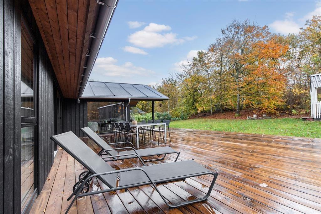 Hjemme igen kan I nyde udelivet på den store træterrasse på hele 116 kvm. Her er masser af plads til både fælles måltider, solbadning og hyggestunder. Den delvist overdækkede del og solsejlet giver mulighed for at være ude i al slags vejr, mens hængekøjen inviterer til ro og en god bog i træernes skygge.