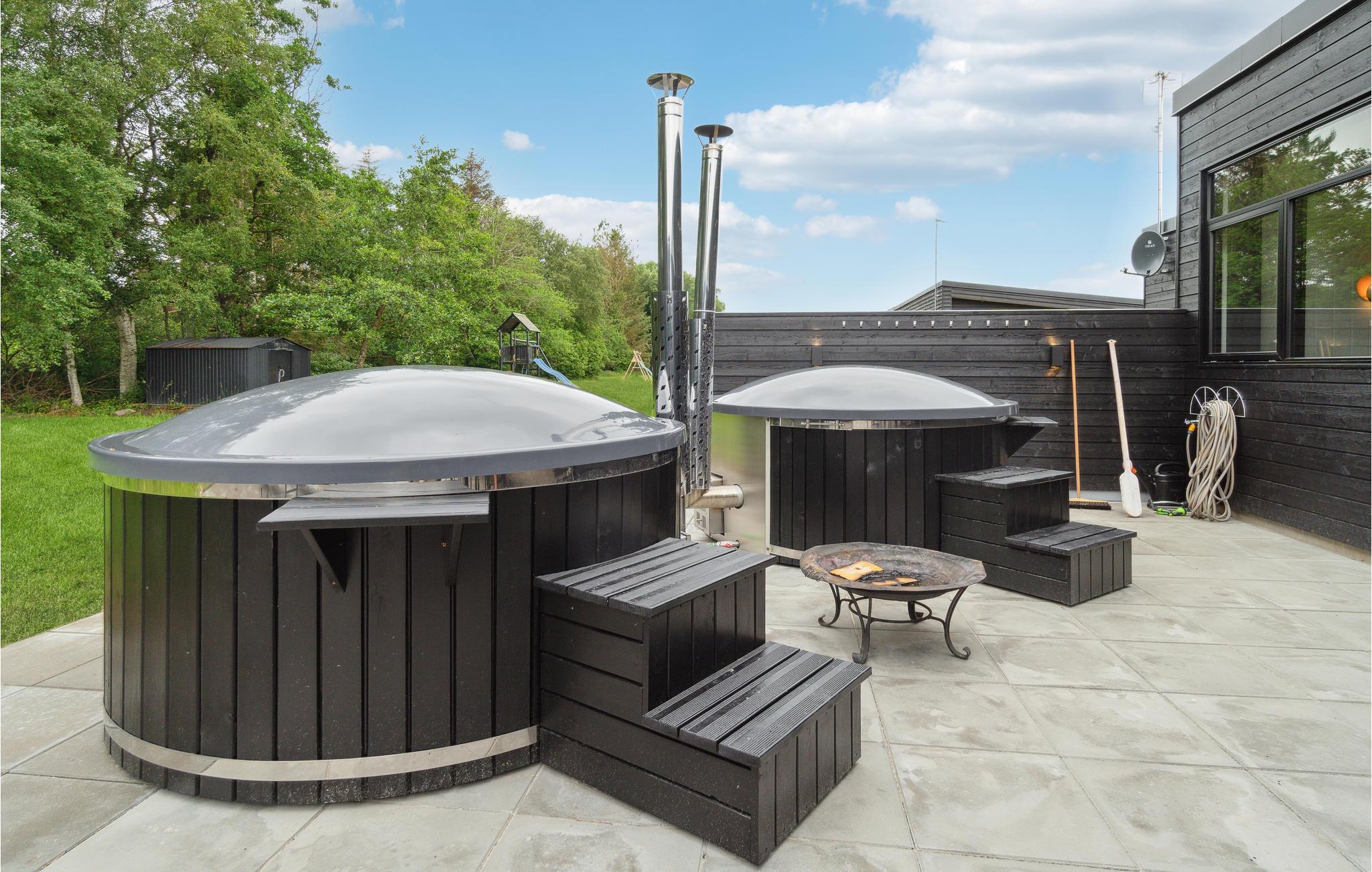 Grunden består af en stor græsplæne og en herlig terrasse, hvor I kan nyde sommerdagene i fulde drag. Sæt jer godt til rette i havemøblerne med en kold forfriskning, mens børnene tumler på plænen og spiller fodbold. Skulle I trænge til lidt ekstra forkælelse oven på en lang dag, kan I læne jer tilbage i vildmarksbadene.