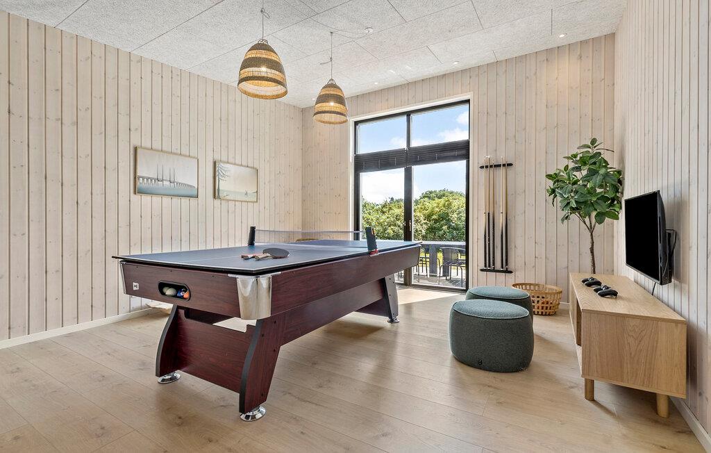 Er I på udkig efter en veludstyret bolig til årets familiesammenkomst, eller skal I måske holde ferie med flere vennefamilier, er dette dejlige hus ved Fjellerup Strand det helt rette valg for jer. Huset er virkelig flot indrettet med kvalitet og komfort over hele linjen. Interiøret fremtræder flot og indbydende med velvalgte materialer, dejlige lysindfald fra flere sider og et moderne, fuldt udstyret køkken, hvor kokkene kan tage sig god tid til at kræse om livretterne. Efter aftensmaden kan I snuppe et slag bordtennis, slappe af i stuen eller, måske I skal forkæle jer selv med en lækker aftentur i saunaen eller det udendørs spabad?