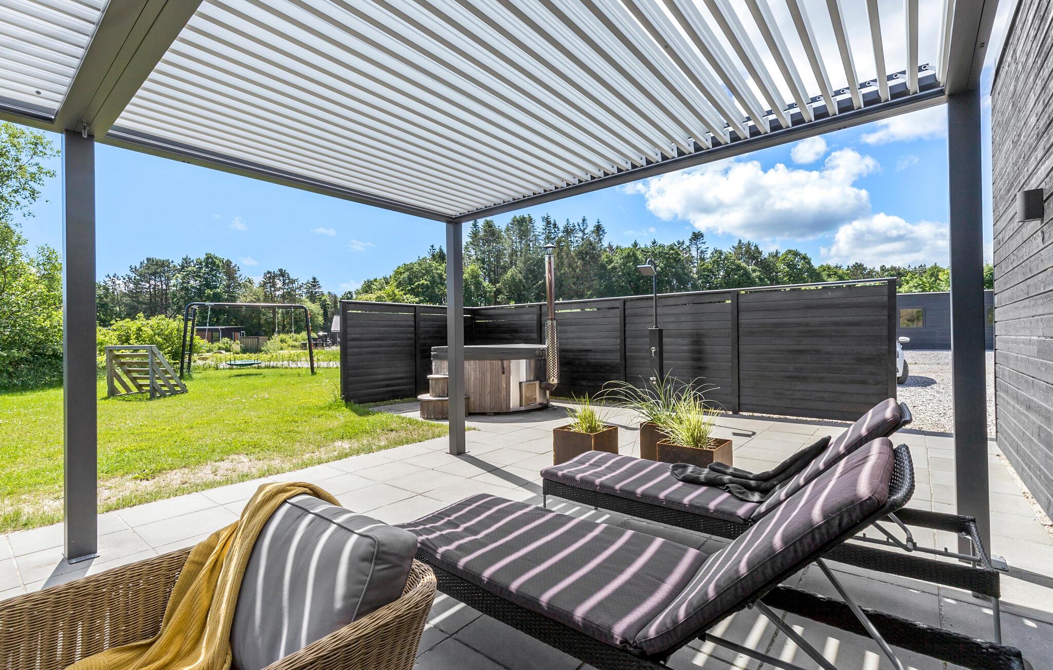 Huset ligger på en flot, ugeneret grund, hvor I kan nyde solen i mange timer, når vejret er godt. Her er der fine legeredskaber til børnene, komfortable møbler til de voksne og en grill, hvor I kan lade aftenen gå på hæld med gode bøffer og grillspyd under den lune aftensol.