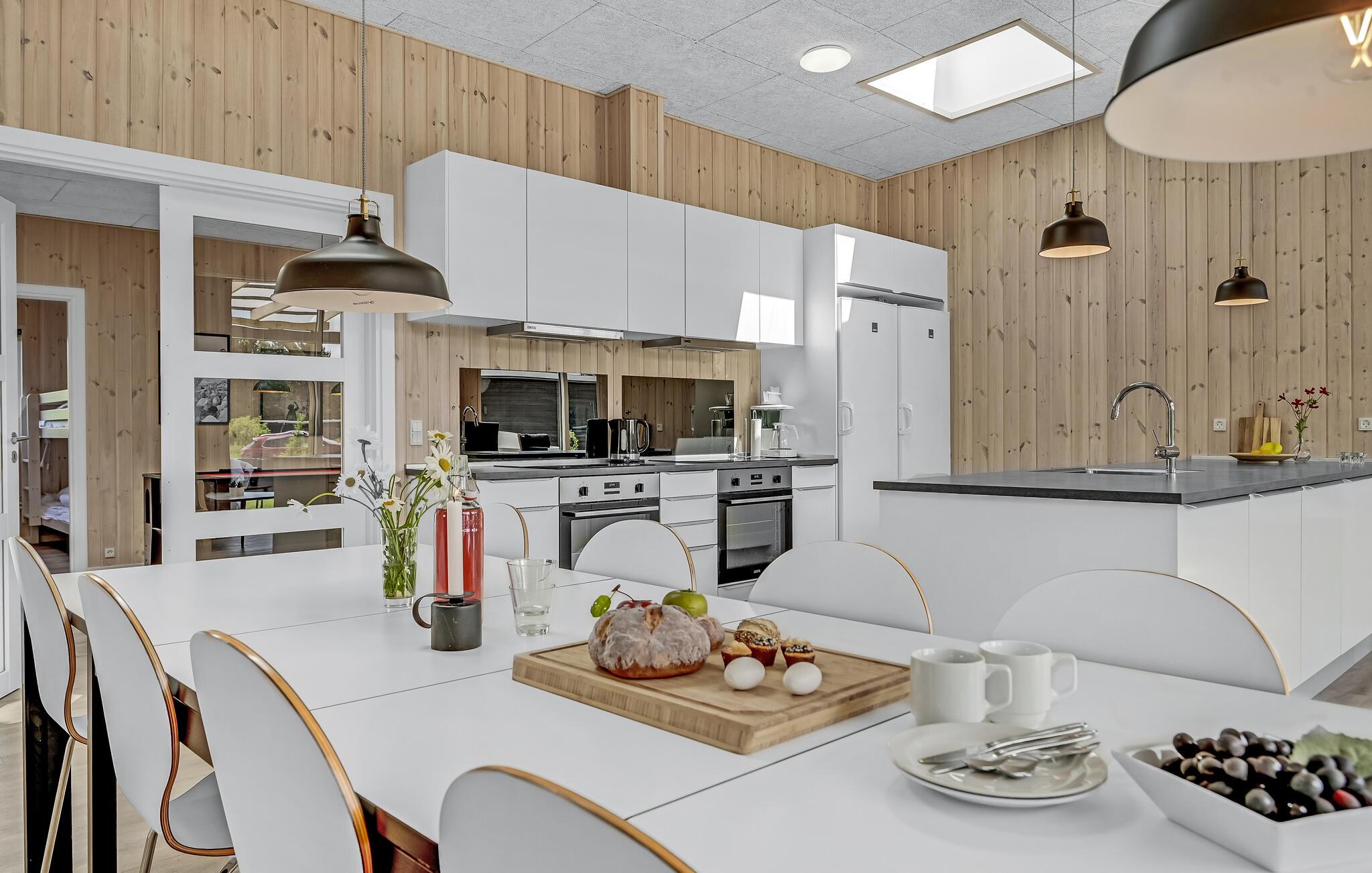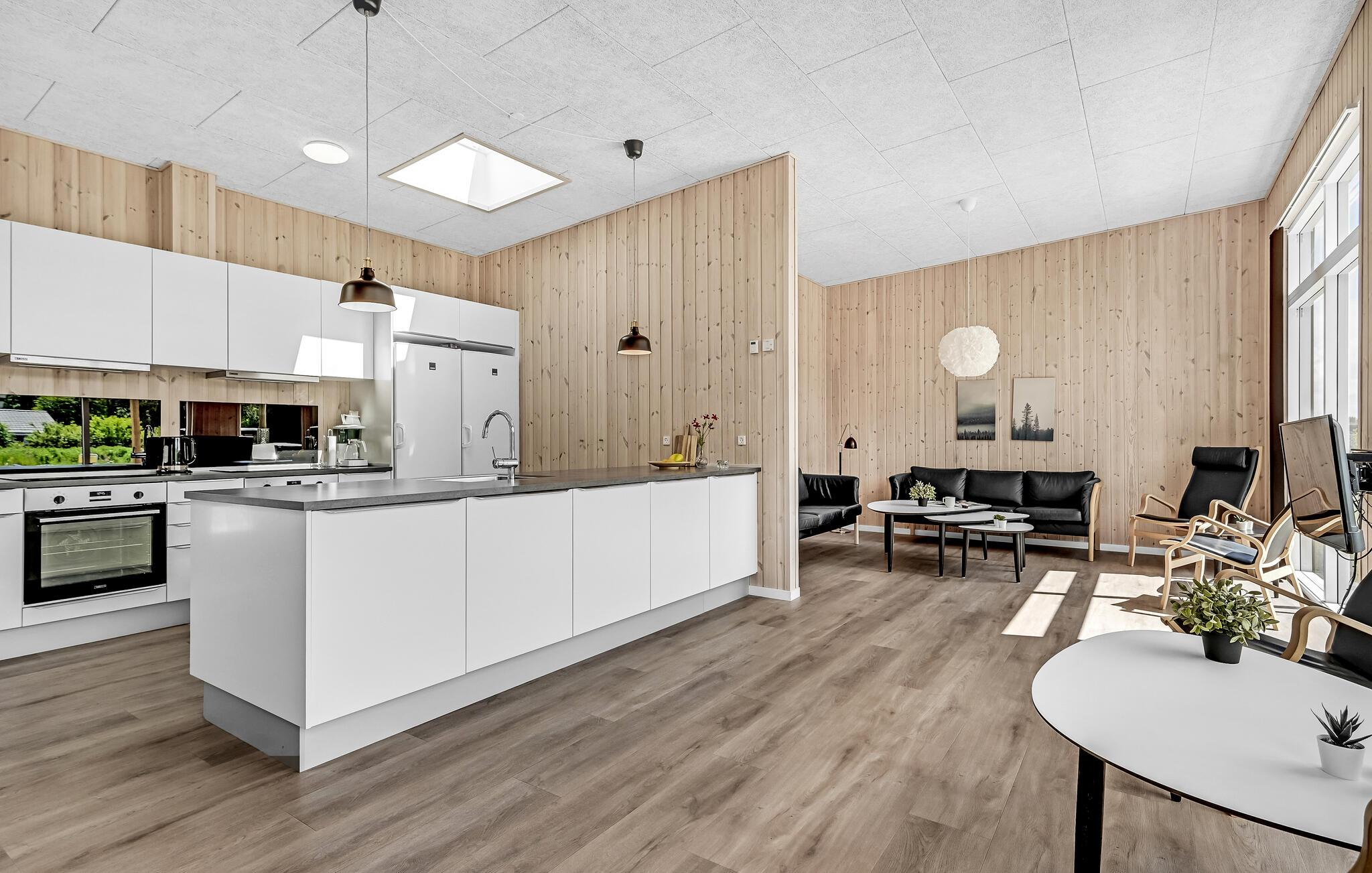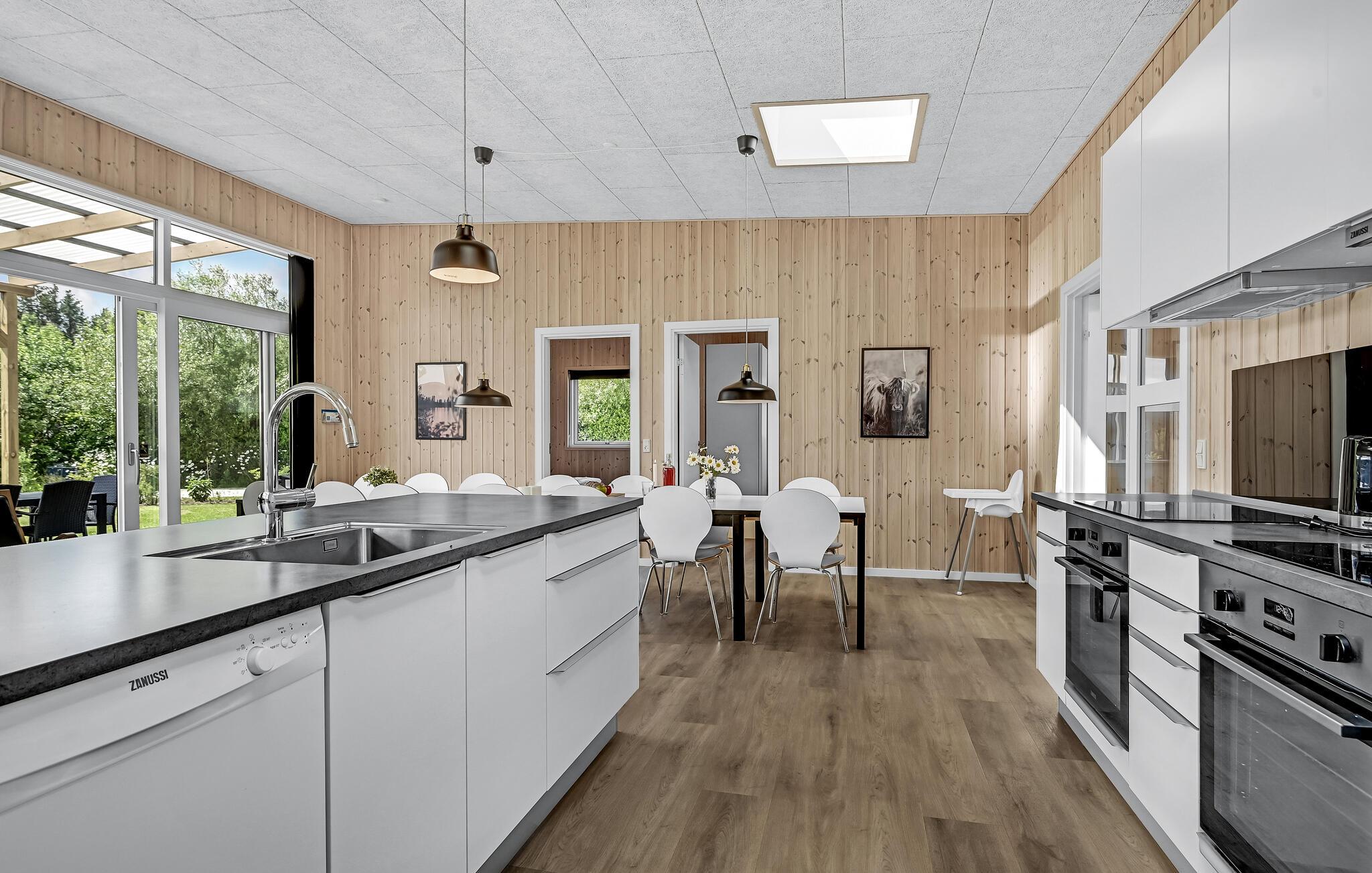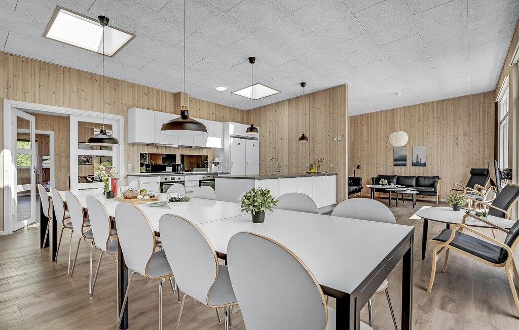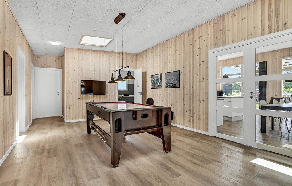 Dette store og komfortable feriehus tilbyder ideelle betingelser for en afslappende ferie med mange gæster. Huset kan rumme 16 personer i 6 store soveværelser. Op til to kæledyr er også velkomne. Husets hjerte er det åbne køkken med et langt spisebord og udsigt over haven, hvor I kan nyde feriens måltider sammen. Den smukke stue er også placeret her. Takket være aktivitetsområdet bliver det garanteret ikke kedeligt, her kan I blandt andet konkurrere i billard. Hele huset er udstyret med gulvvarme for ekstra komfort på køligere dage.