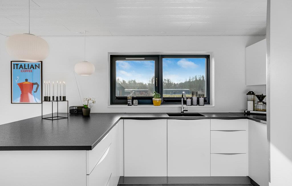 Der venter jer nogle fantastiske feriedage i dette indbydende hus, som ligger i gåafstand fra kysten på Djurslands nordside. Her kan I tilbringe nogle herlige dage i det østjyske og køre et fuldt program - godt afbrudt af pauser i denne flotte oase. De store gulv til loft-vinduer giver jer frit udsyn til de grønne omgivelser, og interiøret er holdt i lyse, rolige farver, så her kan man ikke undgå, at pulsen falder, og skuldrene sænkes.