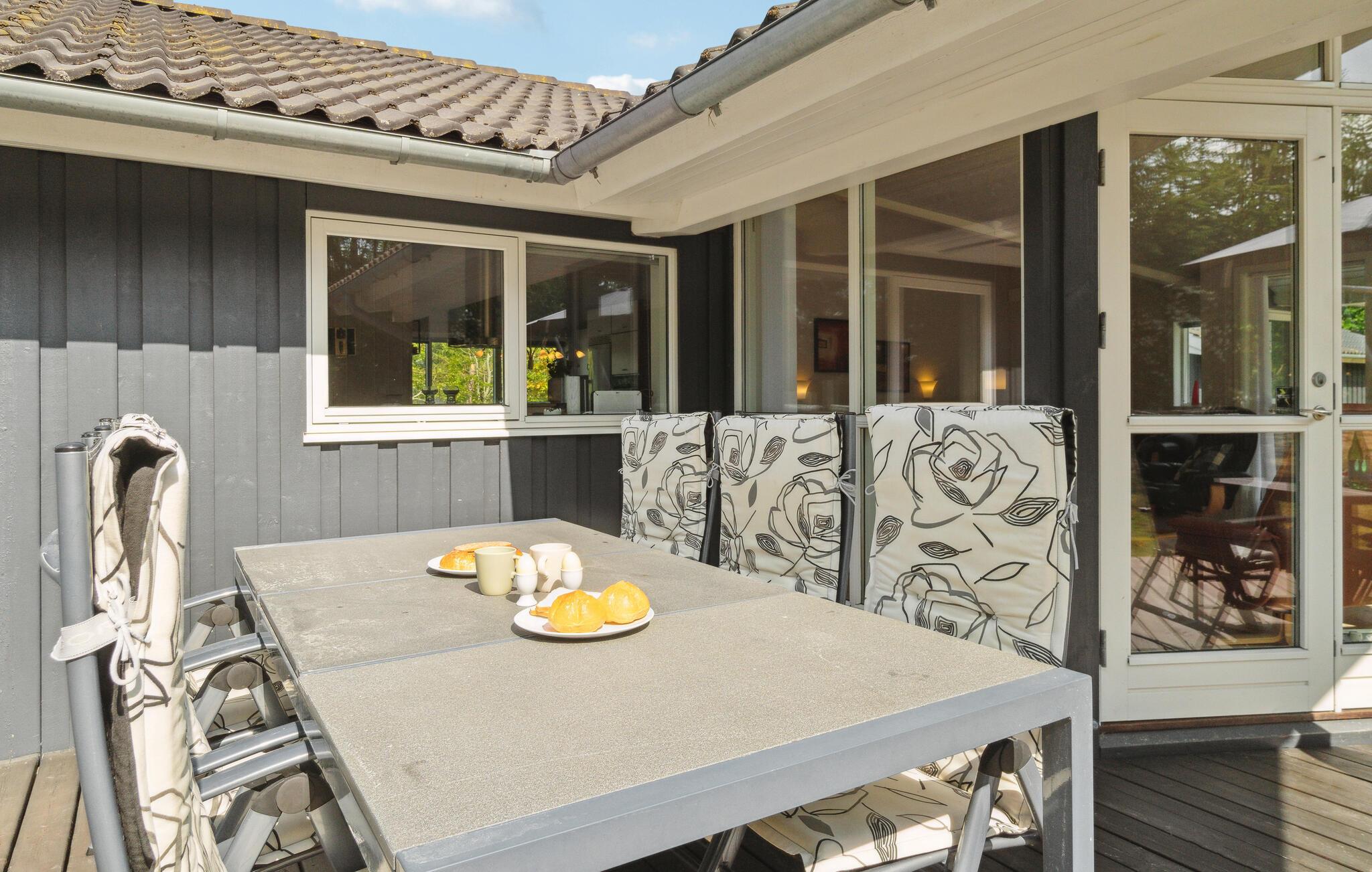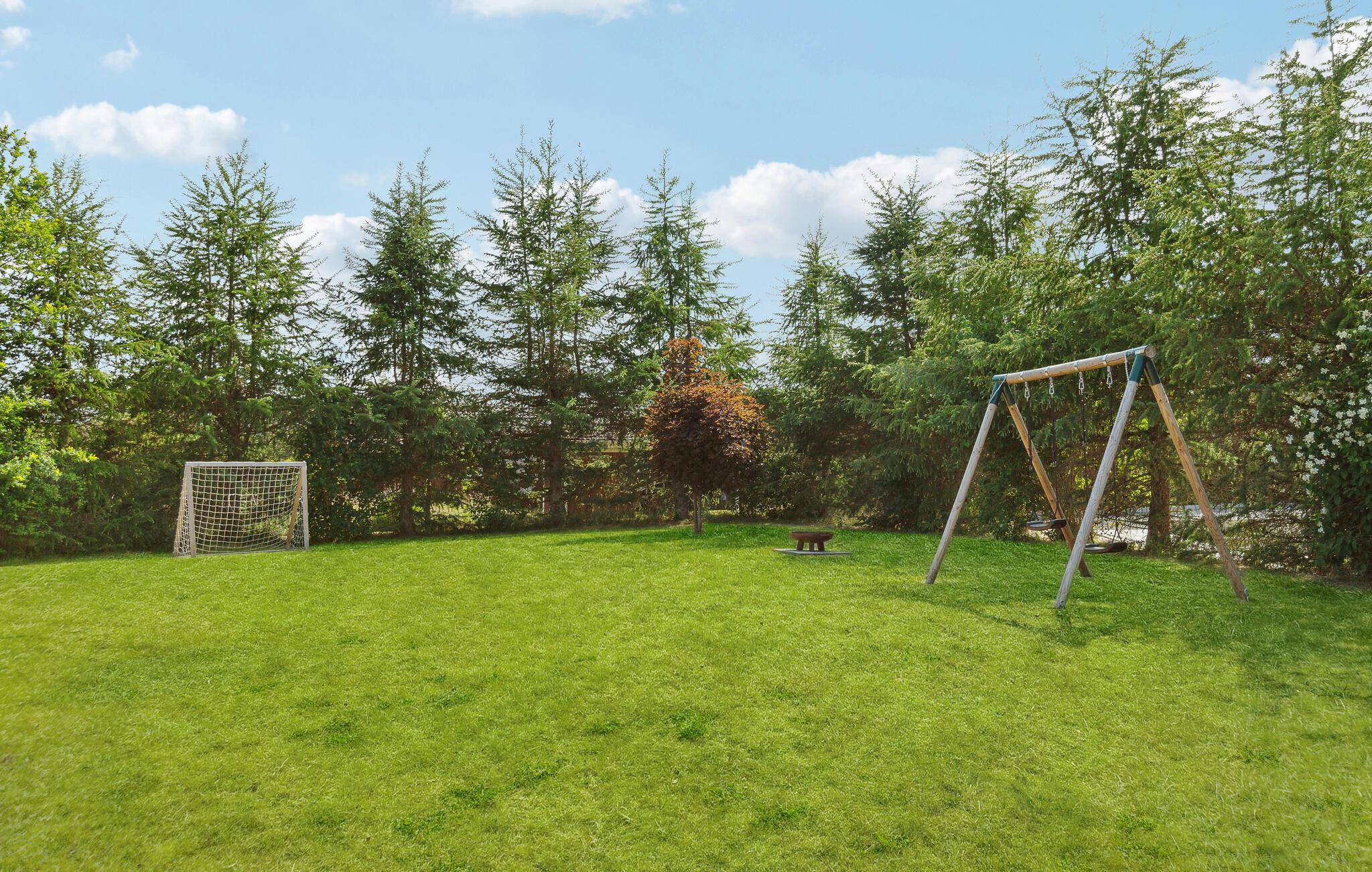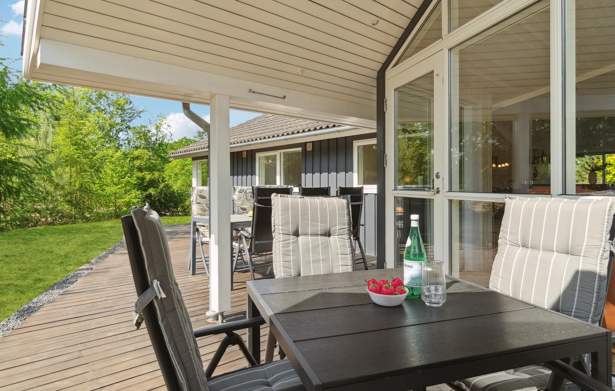 Lækkert feriehus med sauna og spa nær Fjellerup Strand på stor, ugeneret grund med moderne faciliteter.