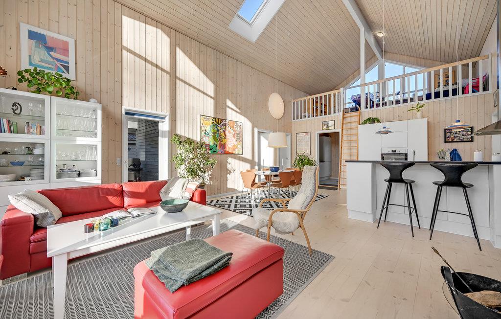 Velkommen i dette flotte, arkitekttegnede sommerhus, der ligger i grønne omgivelser og kun en lille gåtur fra vandet. Husets hjerte er den åbne, høje stue med en rigtig hyggelig hems under det skrå tag. I kan se frem til hyggelige stunder derhjemme, picnic på stranden eller i skoven, svampeplukning og lange gåture i naturen.