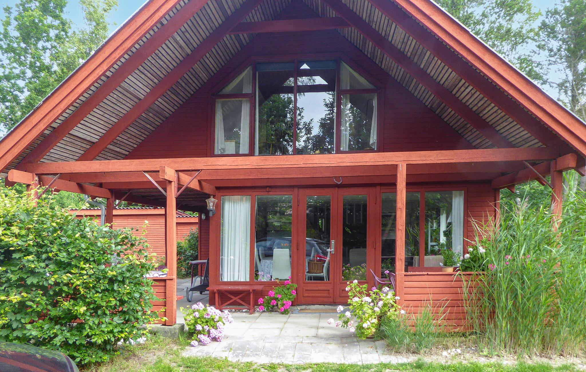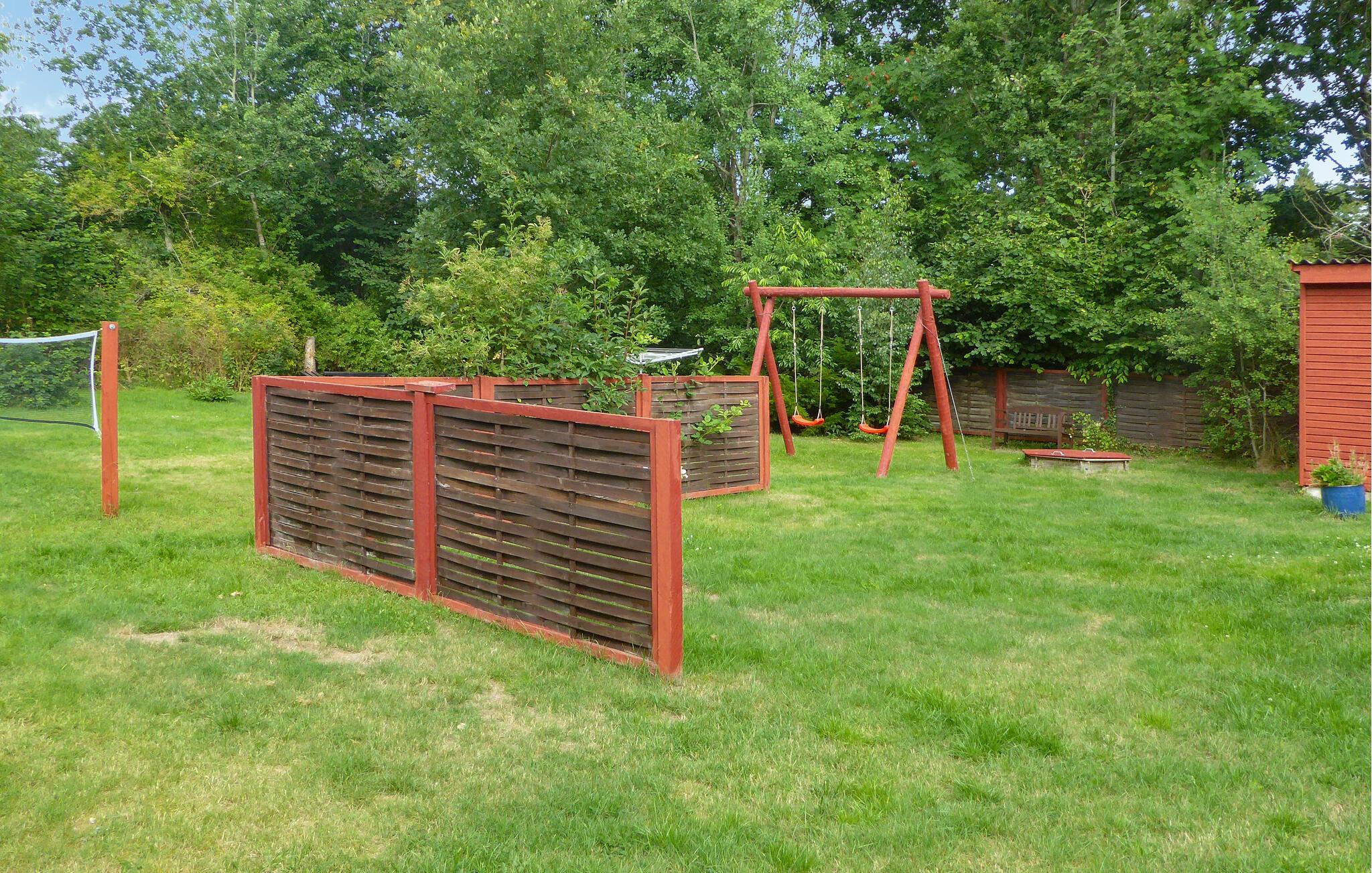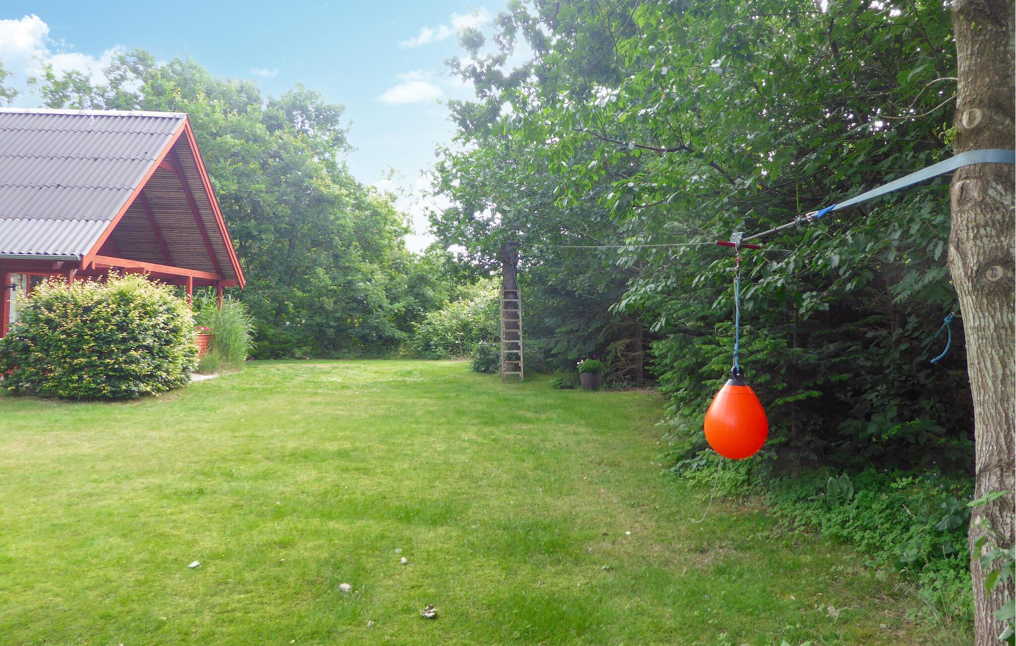 Hyggeligt træhus i frodig have nær Fjellerup strand – perfekt til afslapning og udendørs hygge.