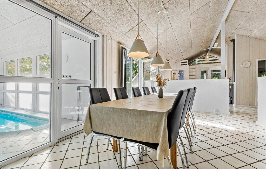 Pragtfuldt og velholdt feriehus, der er indrettet og udstyret således, at det uanset årstid kan danne rammen om en dejlig ferie for såvel en som to familier. Huset er meget energivenligt med 3 varmepumper. Det store poolrum med den skønne pool, spabad samt sauna vil tiltrække de aktive og vandglade, som kan tilbringe adskillige timer her. Fra køkkenet og spisepladsen kan I følge de badendes aktiviteter i vandet, samtidig med at I tilbereder middagen. I den hyggelige, åbne stue kan I nyde varmen fra brændeovnen og se tv på fladskærms-tv'et med chromecast (mediestreaming). Huset ligger på en læfuld og ugeneret grund, i et rekreativt og naturskønt område nær børnevenlig strand og skov. Der er også dejlige vandrestier langs havet. Huset ligger centralt for udflugter til de østjyske ferieattraktioner som bl.a. Skandinavisk Dyrepark, Djurs Sommerland og Randers Regnskov.
