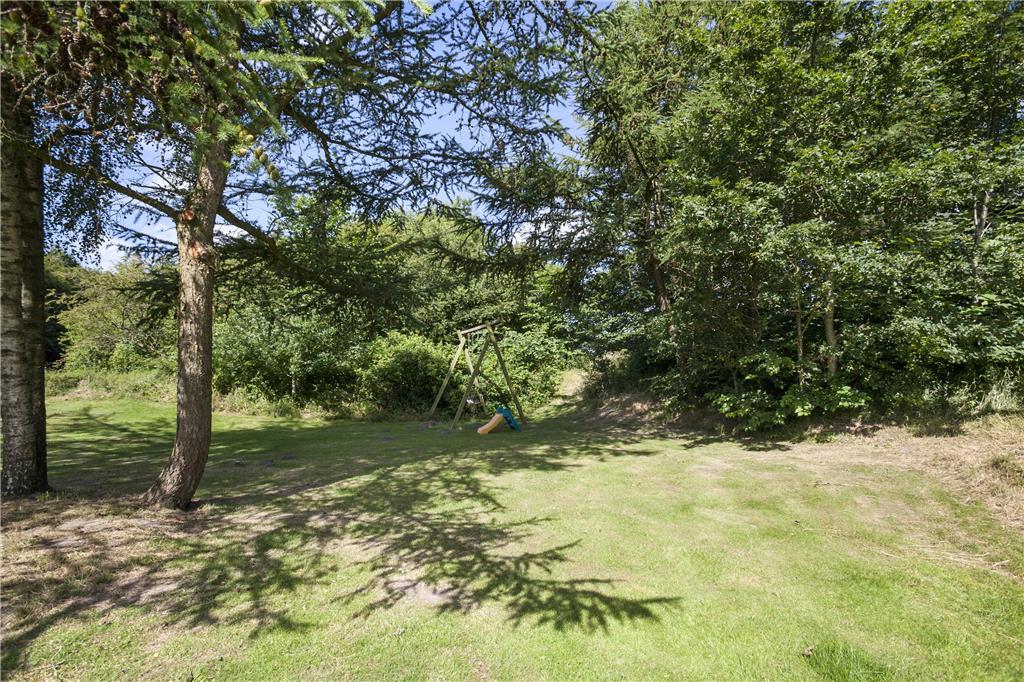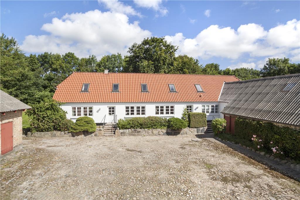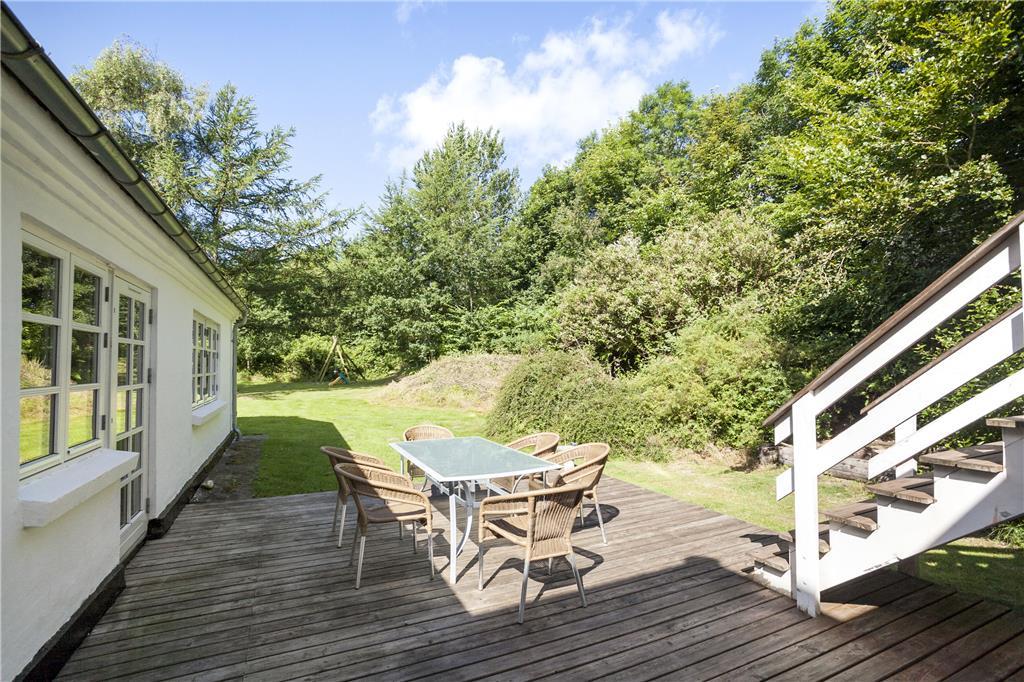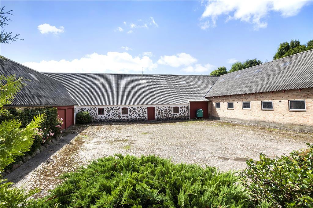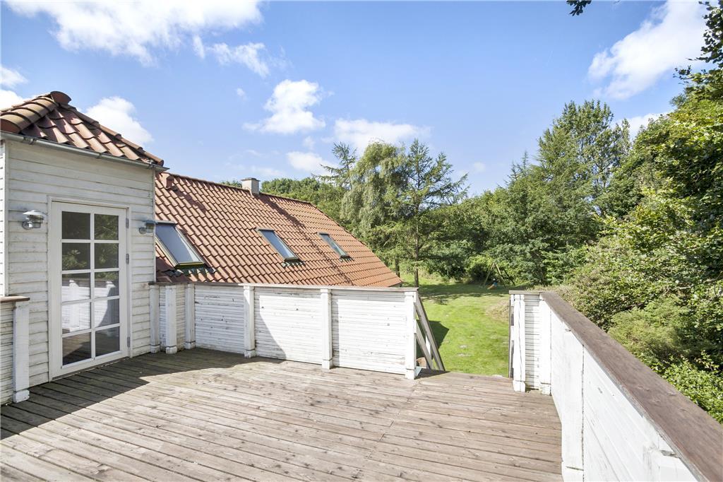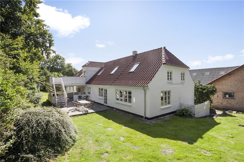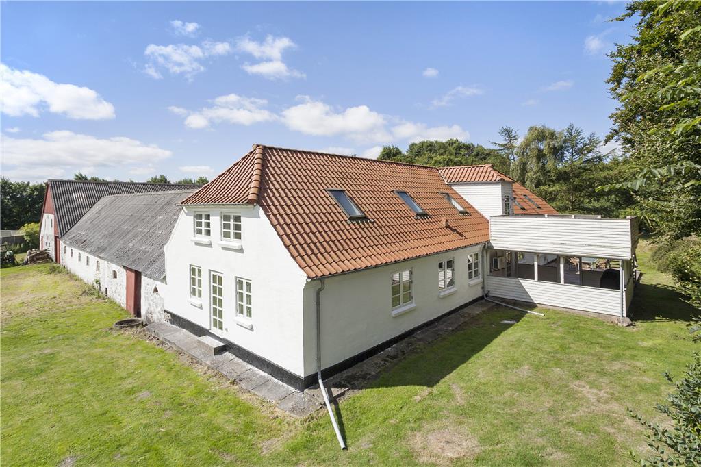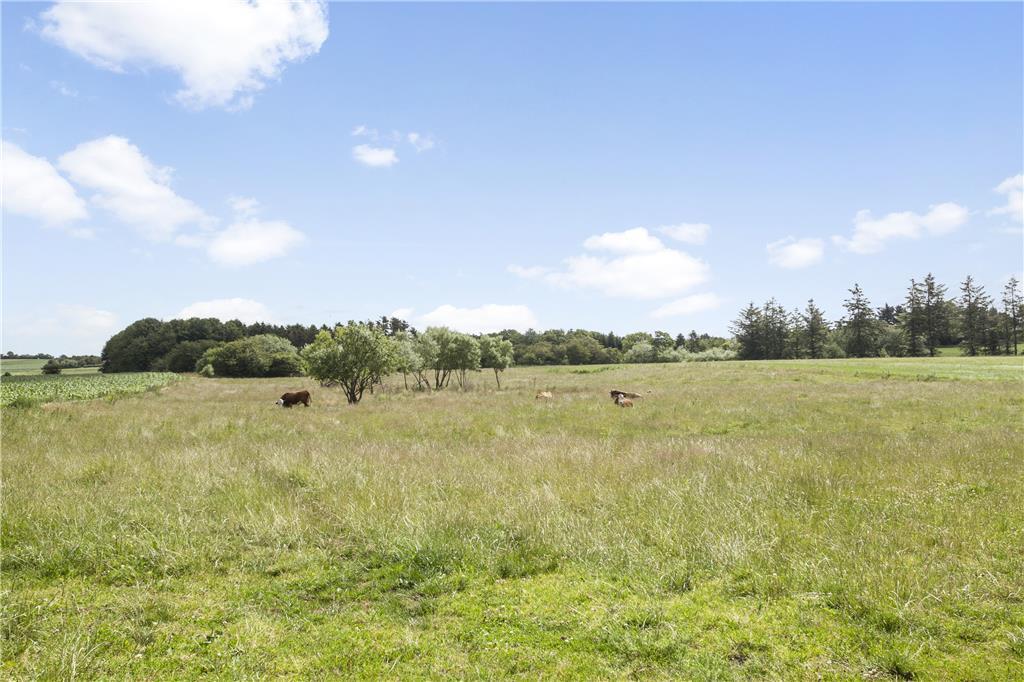 Ejendommen er placeret på en kæmpestor grund med have, gårdsplads og en dejlig afslappende udsigt til marker og græssende køer. Der er både en åben og en overdækket terrasse og på 1.salen også en dejlig balkon, så alle muligheder for at nyde den danske sommer med grillmåltider, solbadning og lange, lyse aftenener er fuldt ud til stede. Stedet ligger isoleret og i rolige omgivelser, men bemærk, at grunden indeholder levn fra landsbrugstiden og færden er på eget ansvar.
