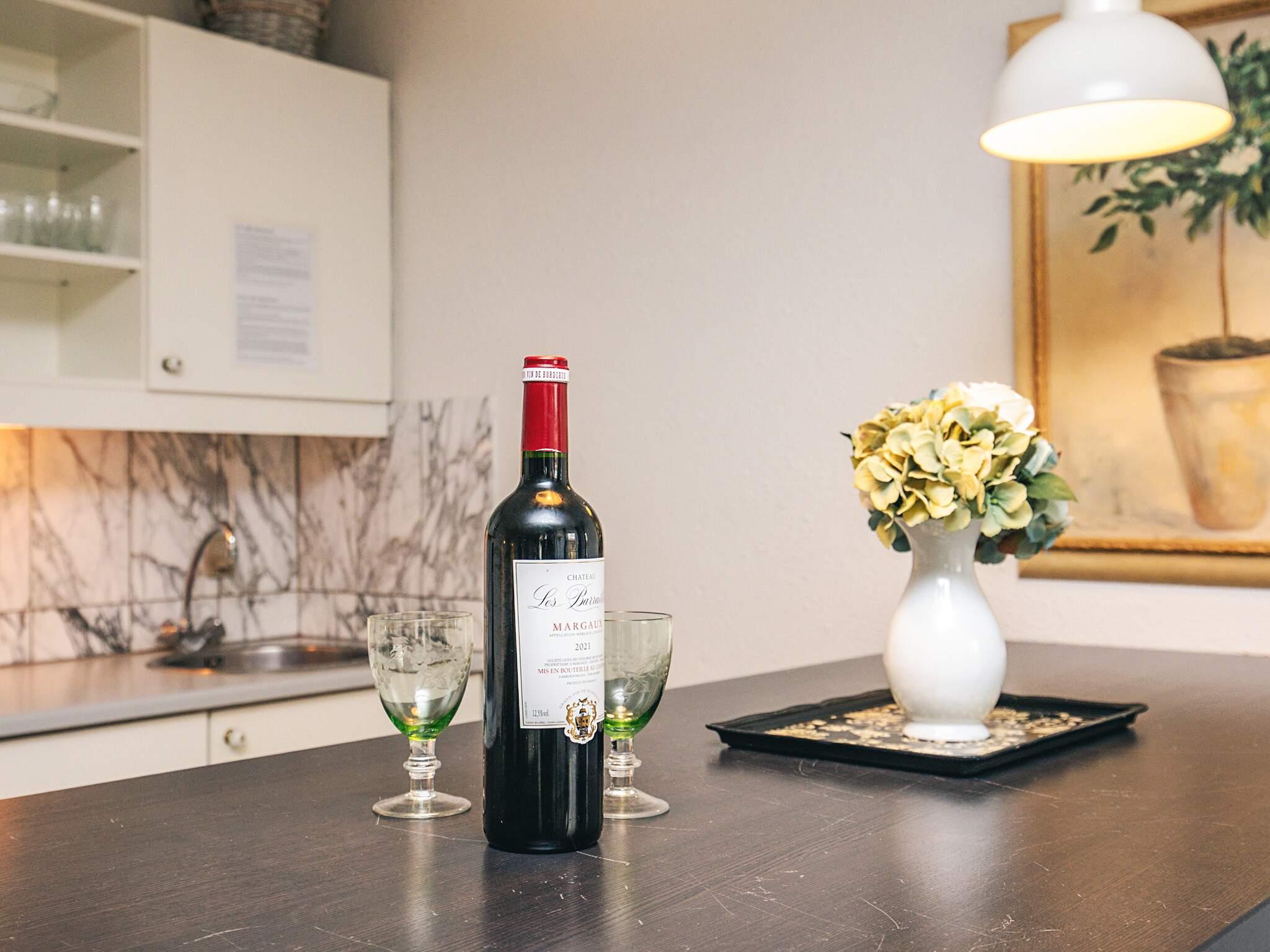 Lejligheden har egen terrasse, hvor du kan nyde morgensolen, slappe af med en god bog eller blot lade blikket glide ud over det grønne område. Atmosfæren er afslappet, stilfuld og ideel til både par, små familier og solo-rejsende, der ønsker at komme helt ned i gear.