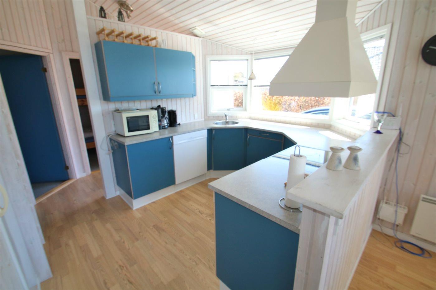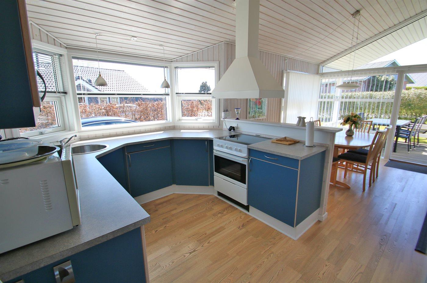 Køkkenet er udstyret med 1 køleskab. Der er 4 keramiske kogeplader, varmluftovn, mikrobølgeovn samt opvaskemaskine.