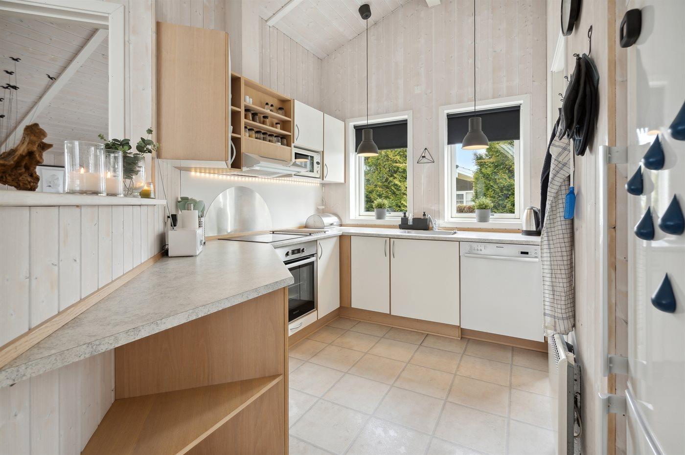 Køkkenet er udstyret med 1 køleskab. Der er 4 keramiske kogeplader, varmluftovn, mikrobølgeovn samt opvaskemaskine.