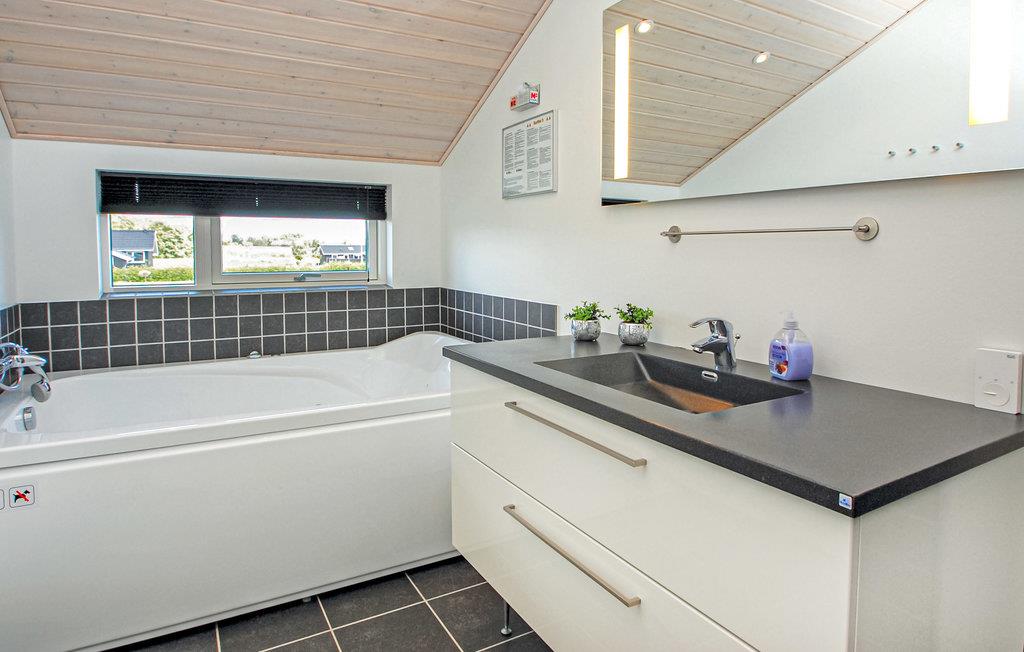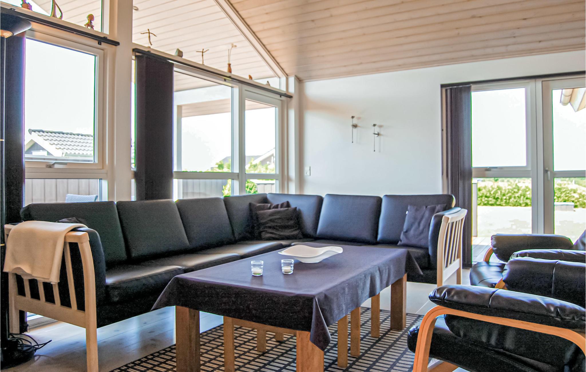 Moderne træhus nær Flovt Strand med spabad, sauna og store terrasser til afslapning.