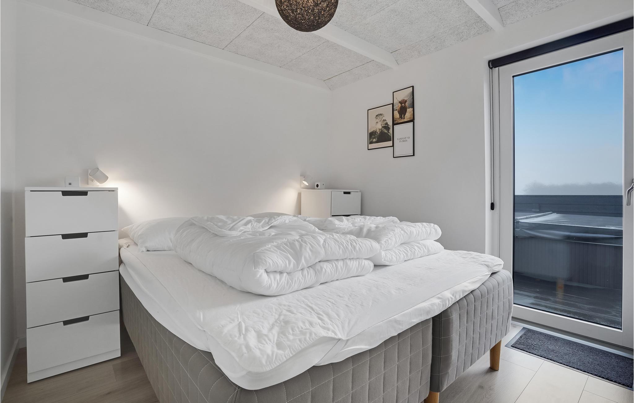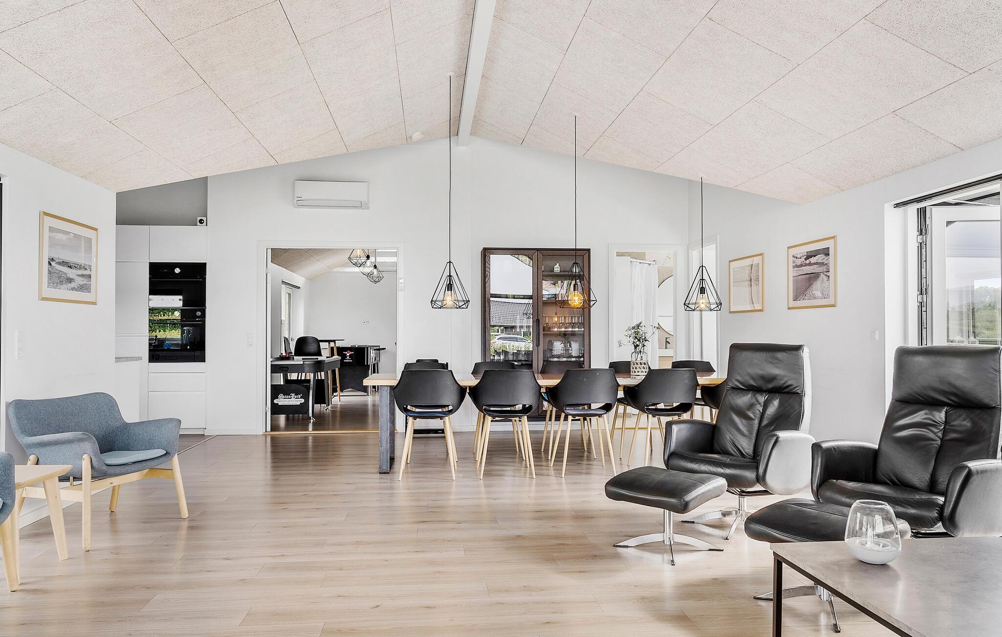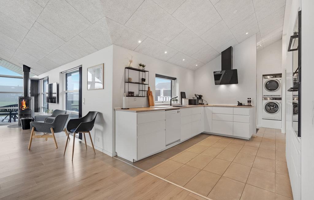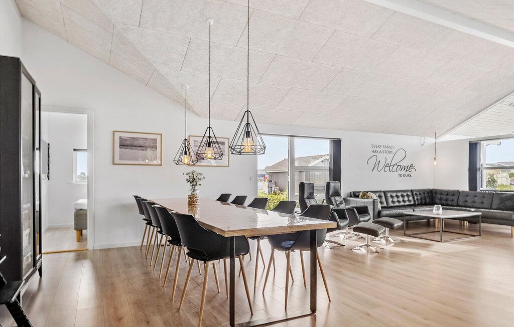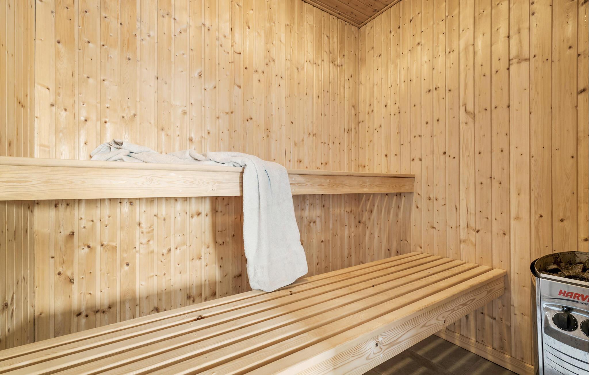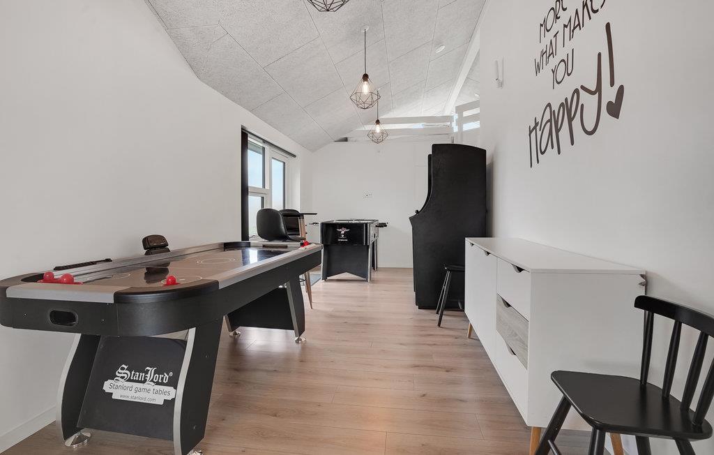 Indendøre møder jer en stor stue i åben forbindelse med køkkenet, her er et dejligt lysindfald fra de store vinduespartier og udgangsmuligheder til terrasserne. Huset har hele to badeværelser, hvor der i det ene er et badekar samt adgang til saunaen, her er der også direkte udgang til udespaen. Der er desuden et fint aktivitetsrum med bordfodbold, airhockey og arkademaskine. Fem fine soveværelser med dobbeltsenge og enkeltsenge.