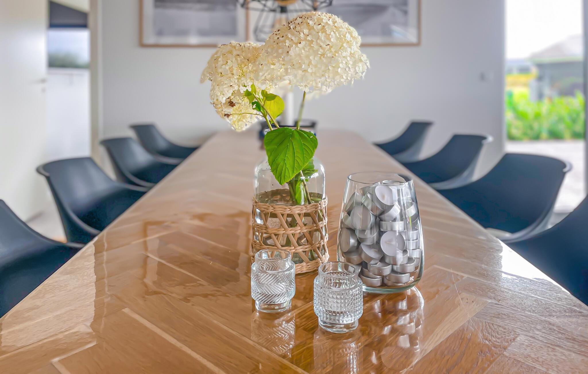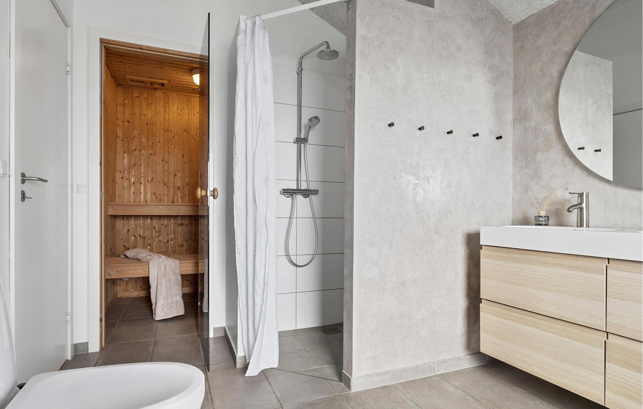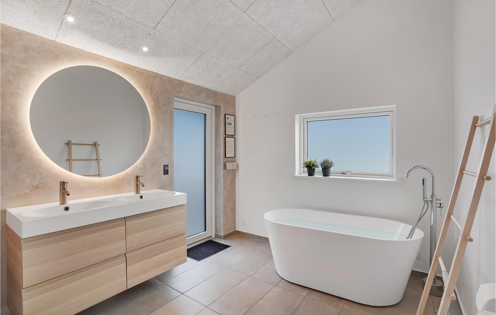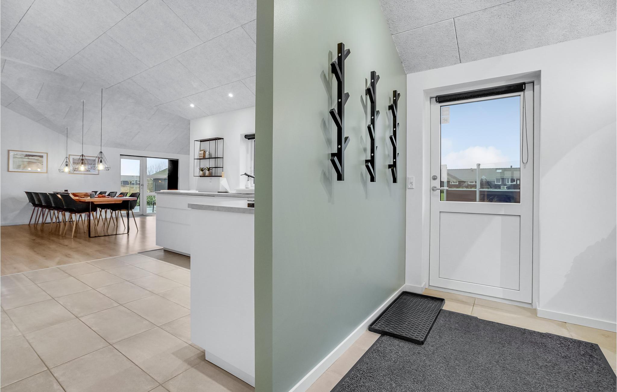 Indendøre møder jer en stor stue i åben forbindelse med køkkenet, her er et dejligt lysindfald fra de store vinduespartier og udgangsmuligheder til terrasserne. Huset har hele to badeværelser, hvor der i det ene er et badekar samt adgang til saunaen, her er der også direkte udgang til udespaen. Der er desuden et fint aktivitetsrum med bordfodbold, airhockey og arkademaskine. Fem fine soveværelser med dobbeltsenge og enkeltsenge.