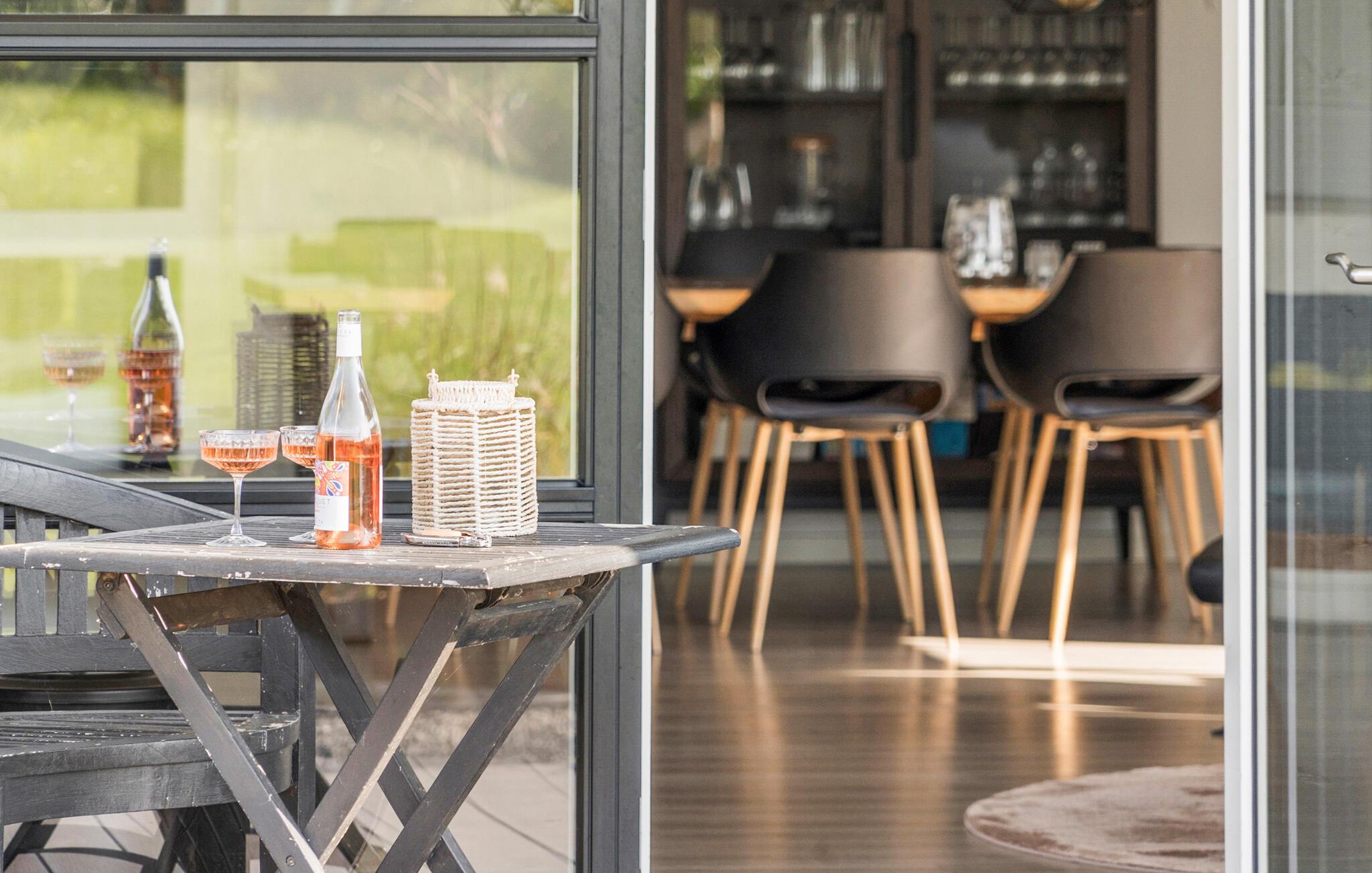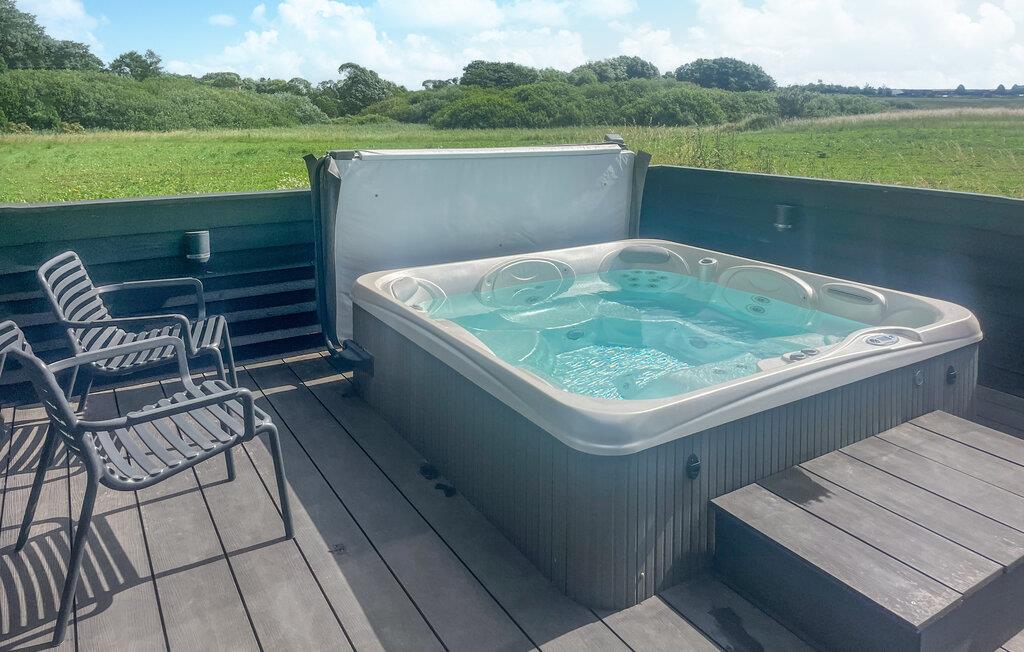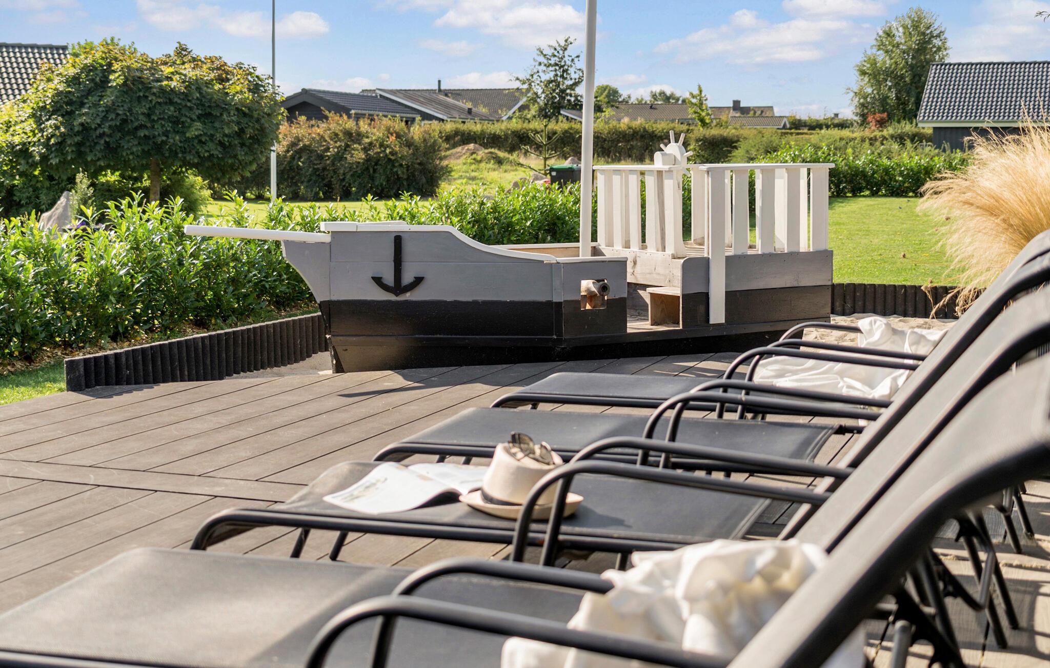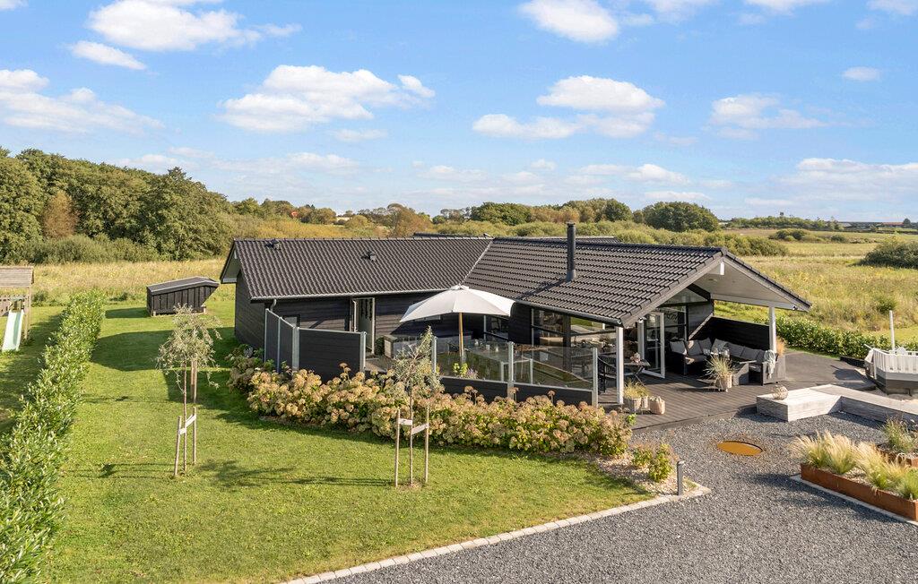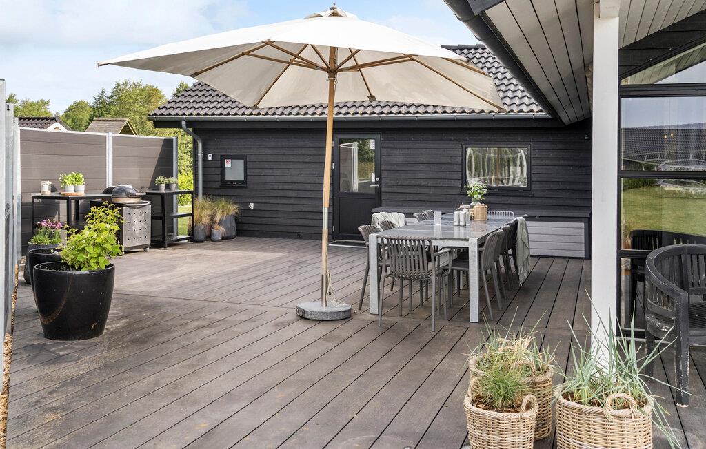 Skønt aktivitets- og wellness feriehus i Flovt med spabad, sauna og stor terrasse med udsigt til åbent landskab.