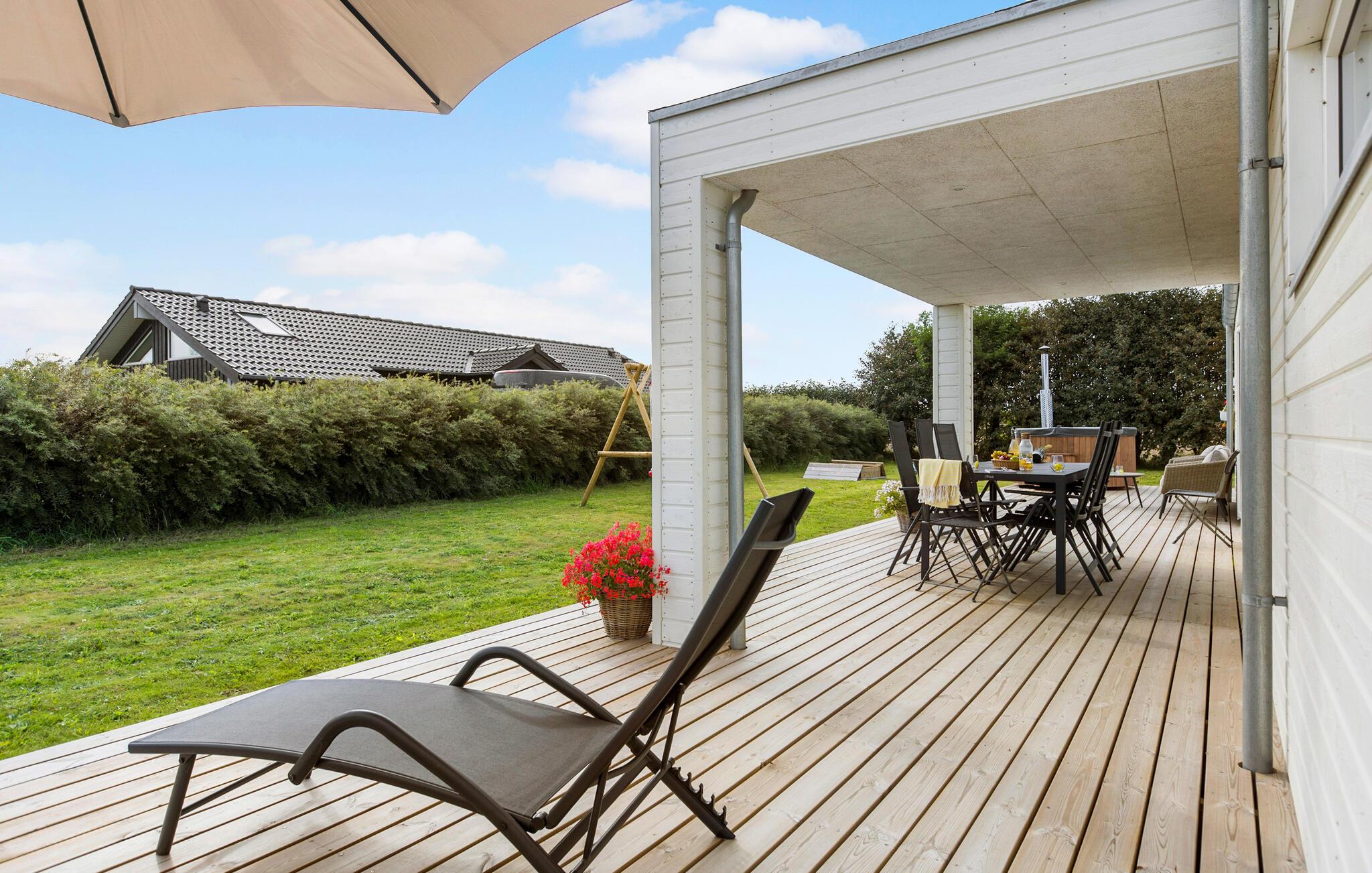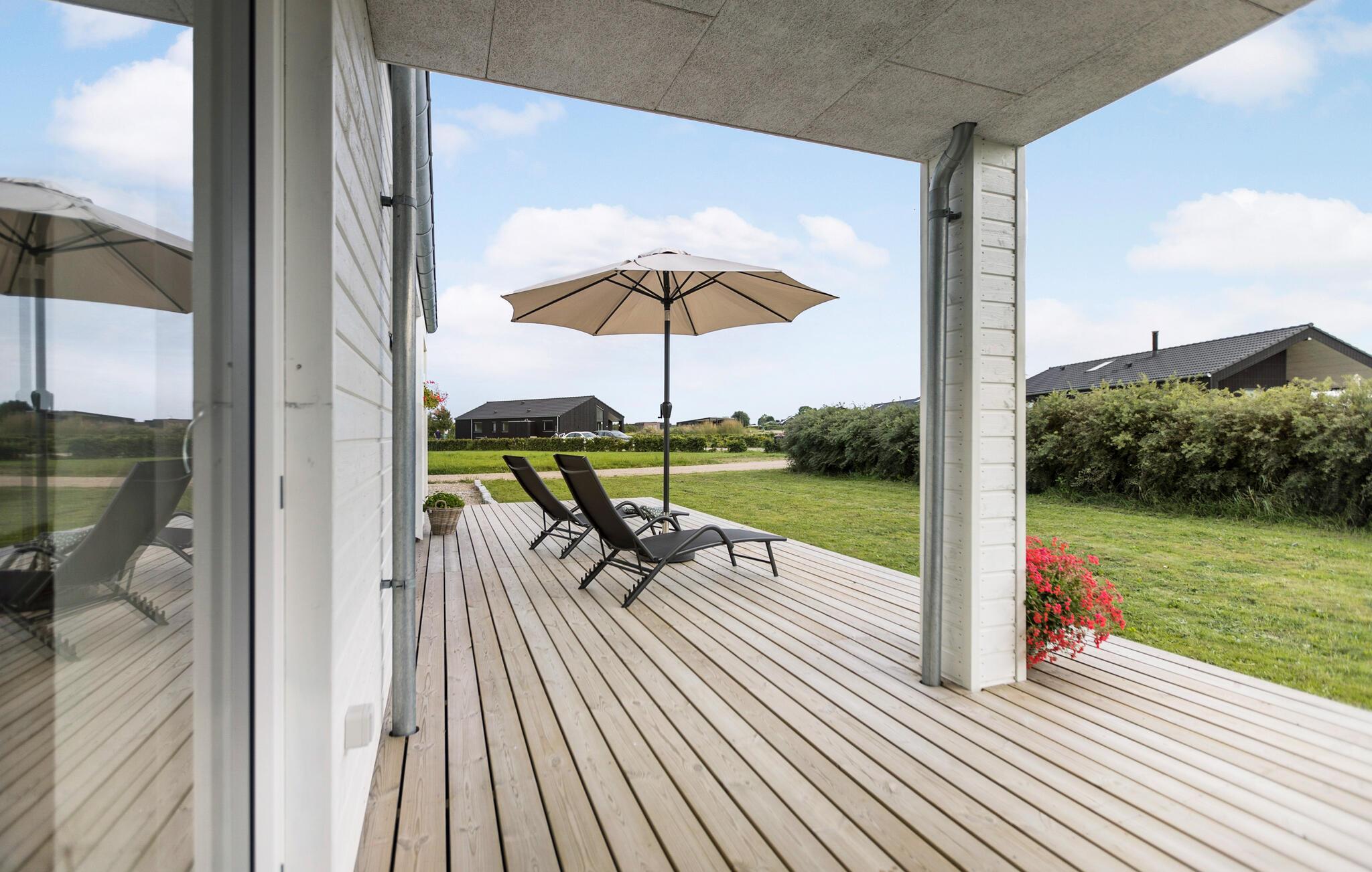 Moderne fritidshus ved Flovt Strand med vildmarksbad, stor terrasse og natur tæt på havet.
