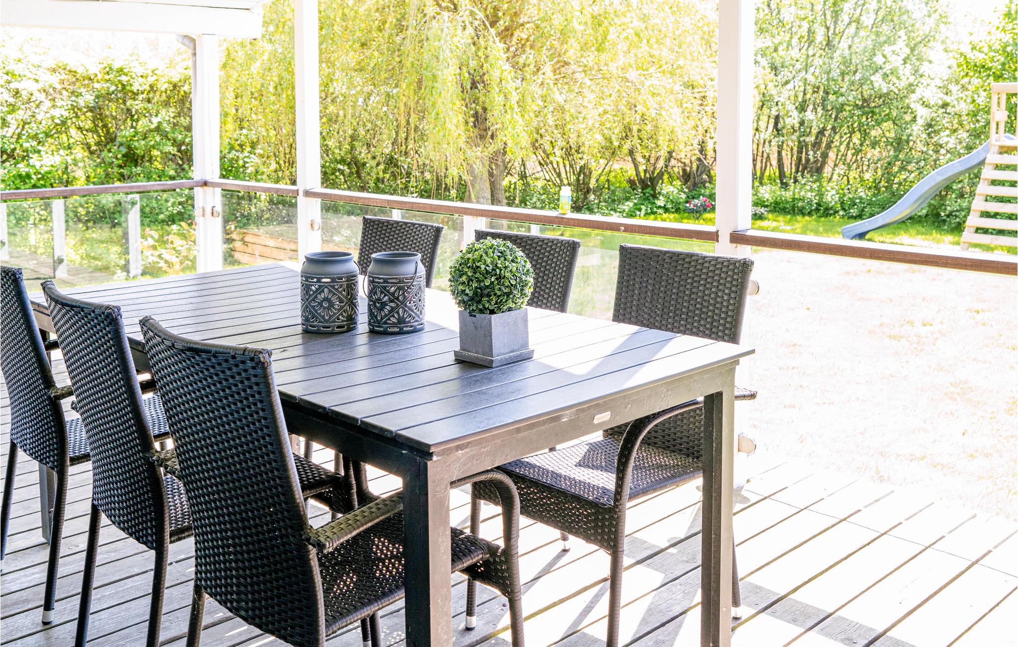 Sommerhus ved Flovt Strand med stor overdækket terrasse og naturskønt område, ideelt til familieferie.