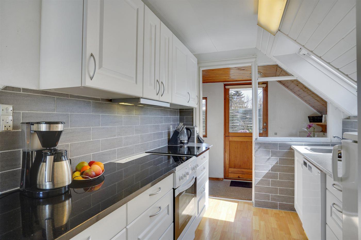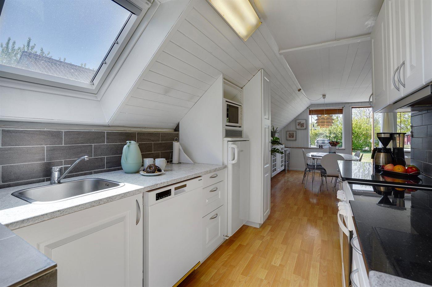 Køkkenet er udstyret med 1 køleskab. Der er 4 keramiske kogeplader, varmluftovn, mikrobølgeovn samt opvaskemaskine.